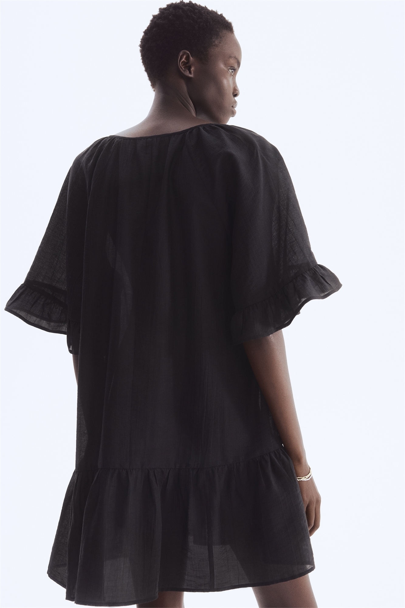 Короткое платье свободного покроя из микса лиоцелла с переплетением крепа. Круглый вырез со сборками по всему периметру, V-образная пройма и узкие завязки спереди. Рукава реглан длиной до локтя с оборками на манжетах и сборкой ниже бедер для придания объема. Без подкладки.