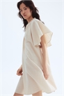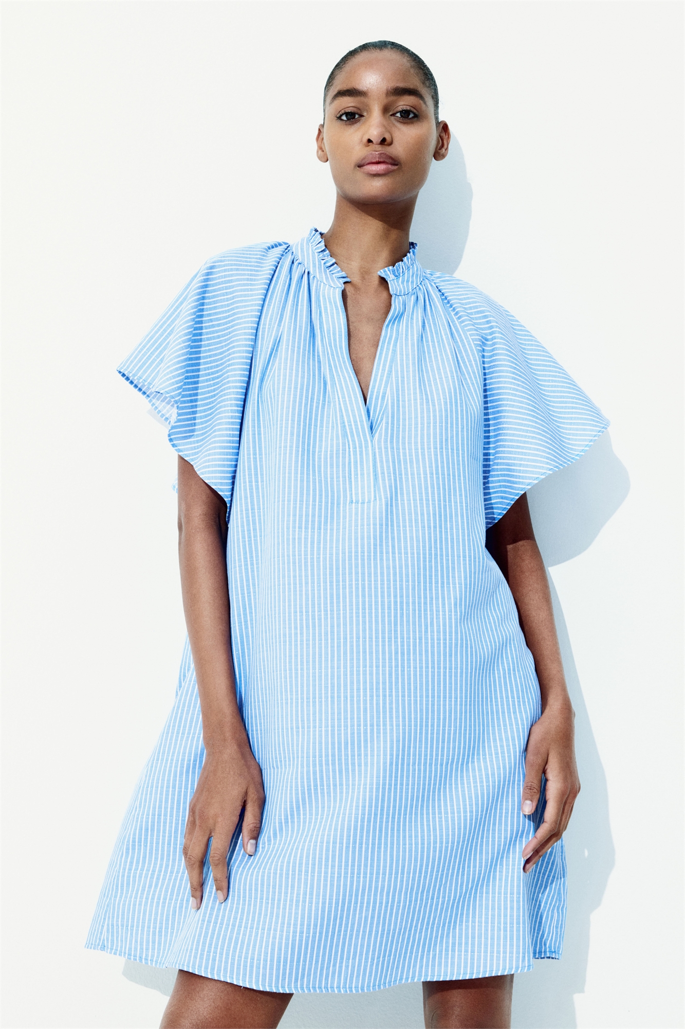 Короткое платье А-линии из мягкого хлопкового муслина с рукавами-бабочками. Отложной воротник со складками по всему периметру и открытая застежка спереди. Без подкладки.