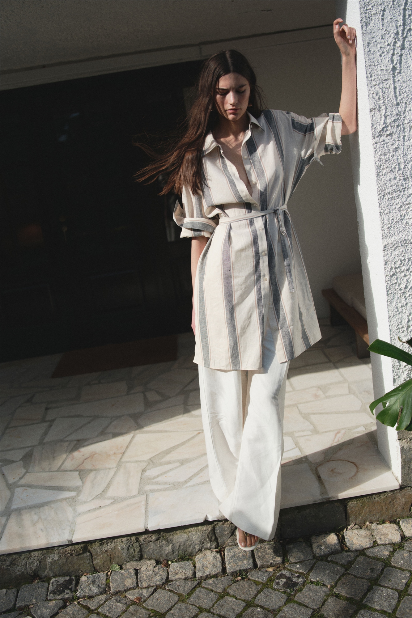 Платье длиной до колена из воздушного льна и хлопка. Воротник, пуговицы спереди и узкий съемный пояс с металлическими D-кольцами. Спущенные плечи и длинные рукава с втачным рукавом, разрезом и пуговицей на манжетах. Подол прямого кроя с разрезом с каждой стороны. Без подкладки.