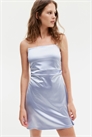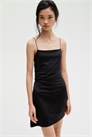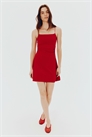 Короткое платье из мягкого трикотажа с квадратным вырезом и бретелями-спагетти. Облегающий лиф со складками по бокам для создания драпировки и мягко расклешенная юбка.