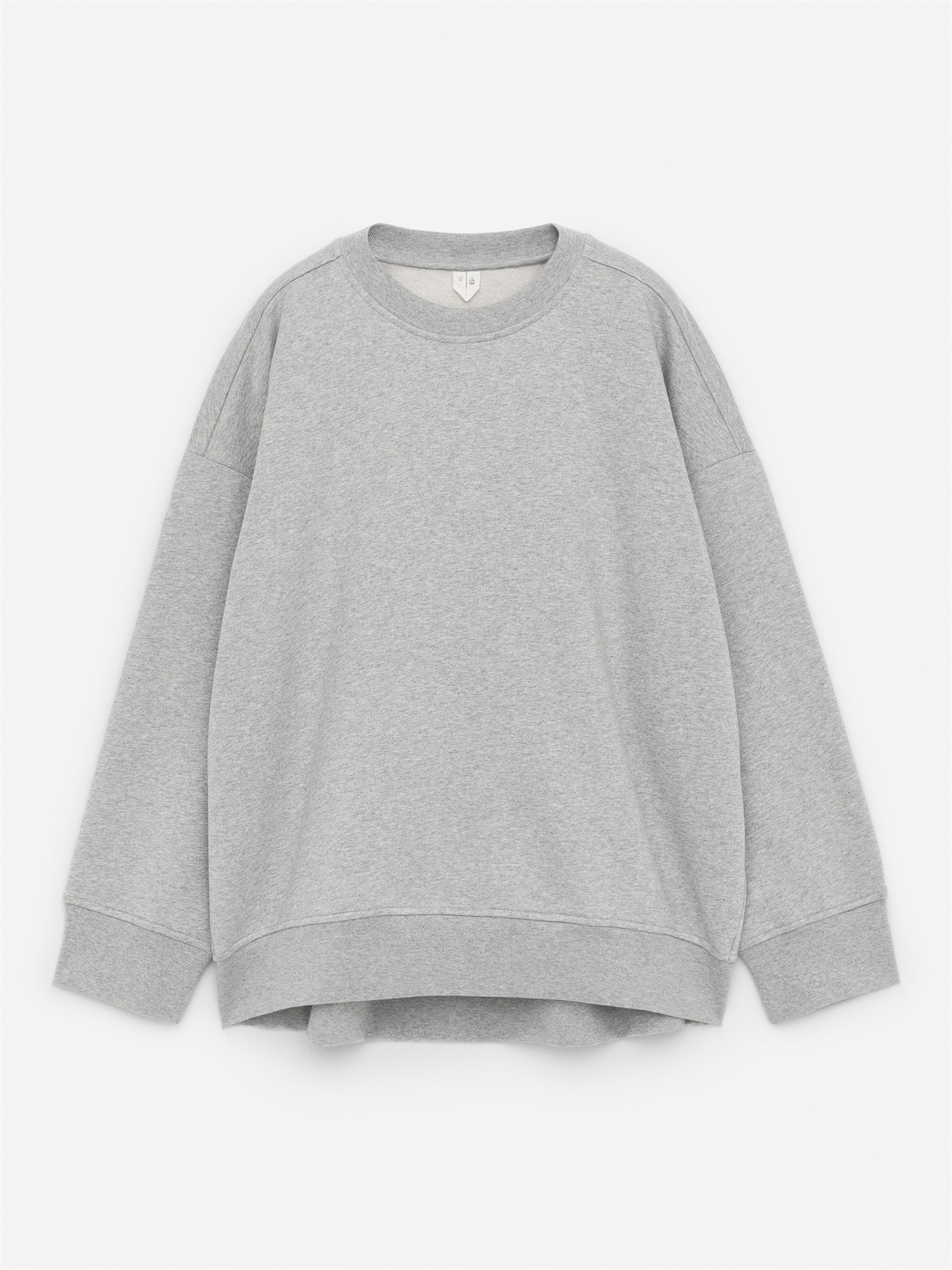 Расслабленная толстовка из хлопка с французской махровой подкладкой для влагоотводящих свойств. Модель с вырезом для экипажа, ребристой отделкой, спущенными плечами и завышенной посадкой.