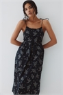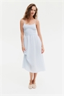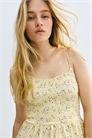 Платье длиной до колен из тканого материала с приталенным лифом, глубоким круглым вырезом и бретелями-спагетти на завязках. Присборенный шов на талии и слегка расклешенная юбка. Без подкладки.