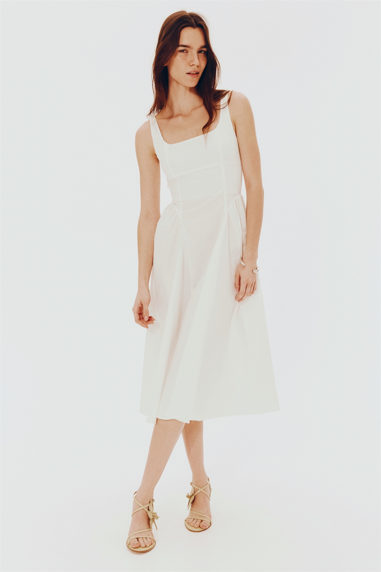 Платье длиной до колена из хрустящего хлопкового поплина с приталенным лифом с квадратным вырезом, широкими бретелями и низким вырезом на спине с горизонтальными завязками. Скрытая застежка-молния сзади и расклешенная юбка со складками на бедрах для придания объема. Частично на подкладке.
