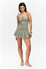 Короткое платье из хрустящей хлопковой саржи с мягкой структурой. С квадратным вырезом и регулируемыми завязками для индивидуальной посадки. Спереди - детали на пуговицах, вшитые складки для придания объема и необработанный нижний слой для тонкого контраста. Застежка-молния сбоку и облегающий крой по лифу.