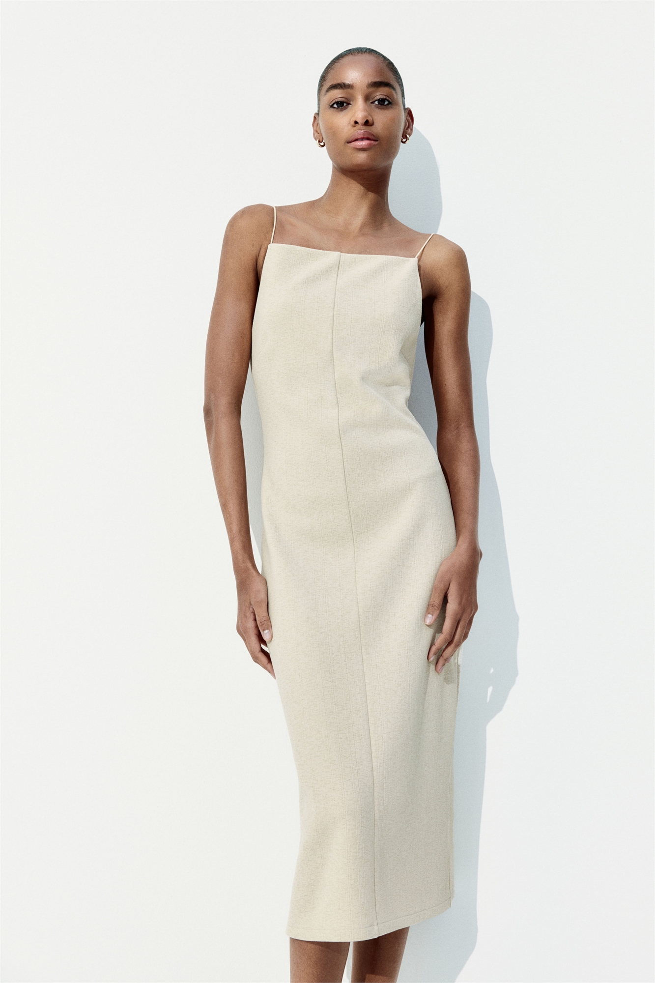Приталенное платье длиной до колен из эластичного джерси с квадратным вырезом и эластичными бретелями-спагетти. Подол прямого покроя с разрезом сзади.