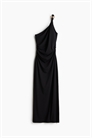 Приталенное платье длиной до щиколоток из фактурного джерси с асимметричным вырезом, одной перекрученной бретелью на плече и сборками по бокам талии для легкой драпировки. Подол прямого кроя с разрезом с одной стороны. Верхняя часть на подкладке.
