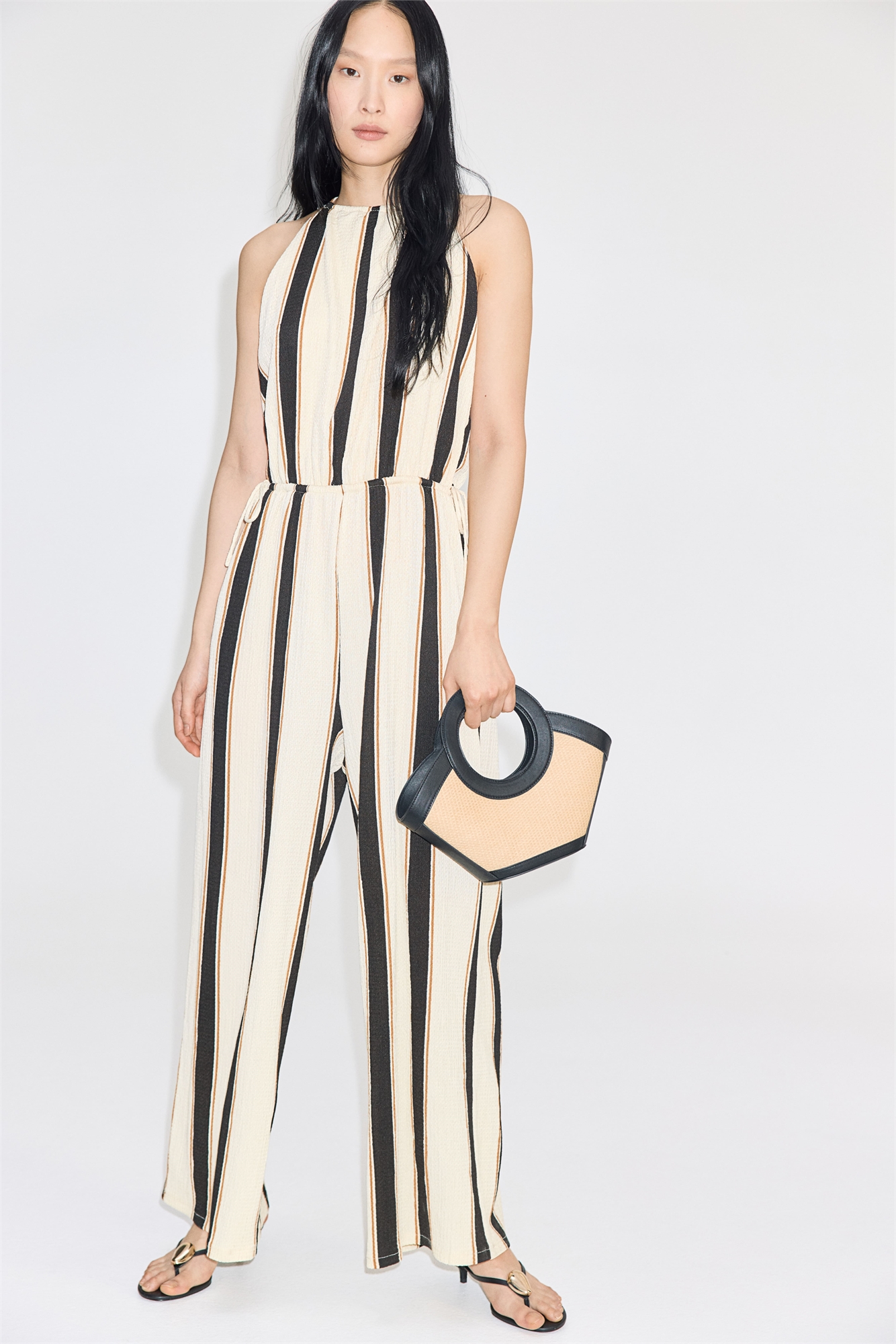 Джемпер из фактурного джерси с узким вырезом в верхней части и круглым вырезом с завязками на спине. Узкая резинка и шнурок на талии с завязками с каждой стороны. Широкие, мягко драпирующиеся ноги.