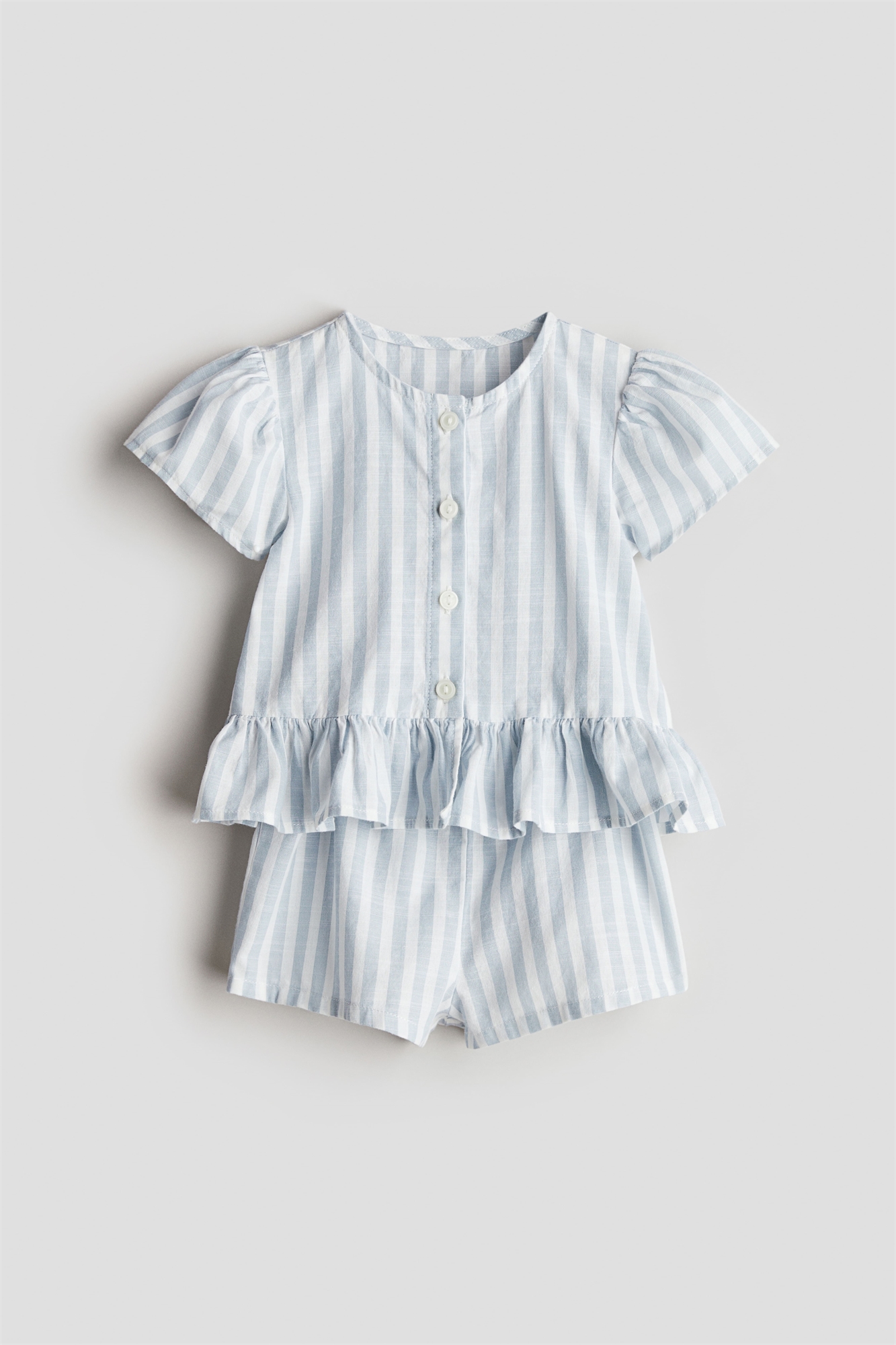 Хлопковый комплект из блузки и шорт с мягким, воздушным плетением. Блузка с круглым вырезом, пуговицами спереди, пышными рукавами и оборчатым подолом. Шорты с регулируемой эластичной талией.