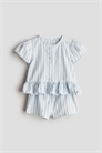 Хлопковый комплект из блузки и шорт с мягким, воздушным плетением. Блузка с круглым вырезом, пуговицами спереди, пышными рукавами и оборчатым подолом. Шорты с регулируемой эластичной талией.