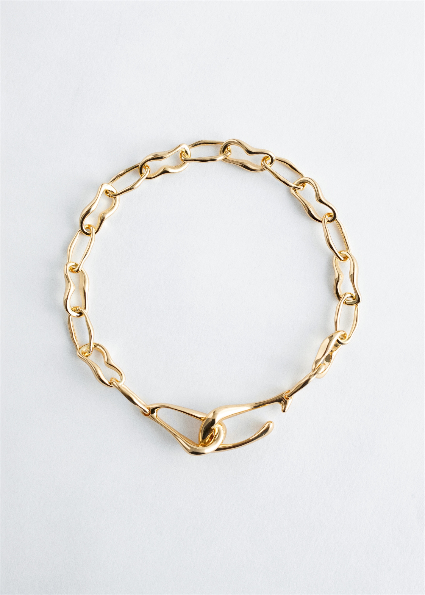 Это короткое ожерелье нанизано на цепочку роло с неровными звеньями. Спереди имеется застежка-крючок большого размера, выполняющая как функциональную, так и декоративную функцию. Общая длина: 45 см / 17,7”
