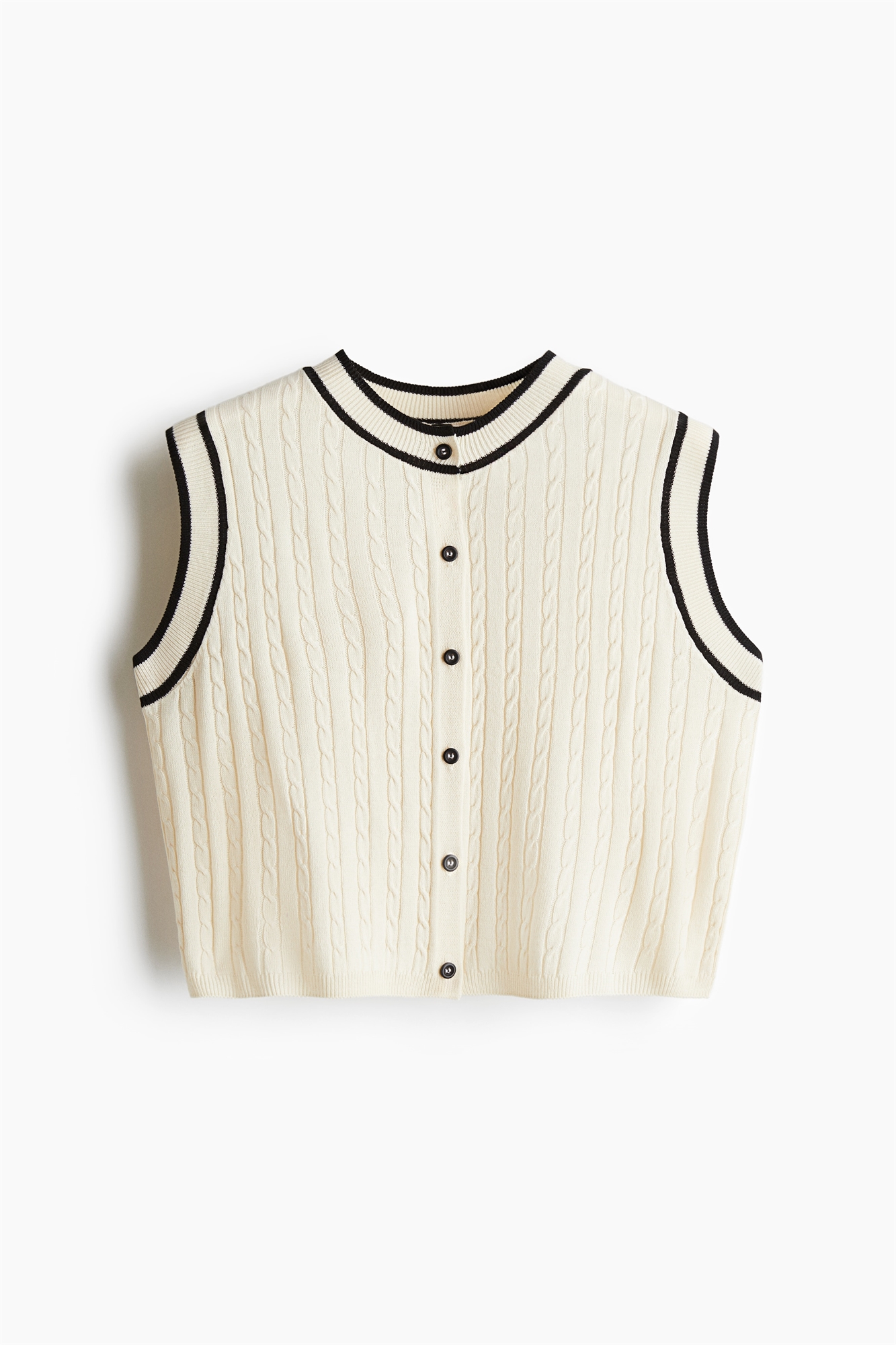 Короткий жилет из мягкого трикотажа с круглым вырезом, отделанным ребрами, и пуговицами спереди. Ребристая отделка по проймам и подолу.