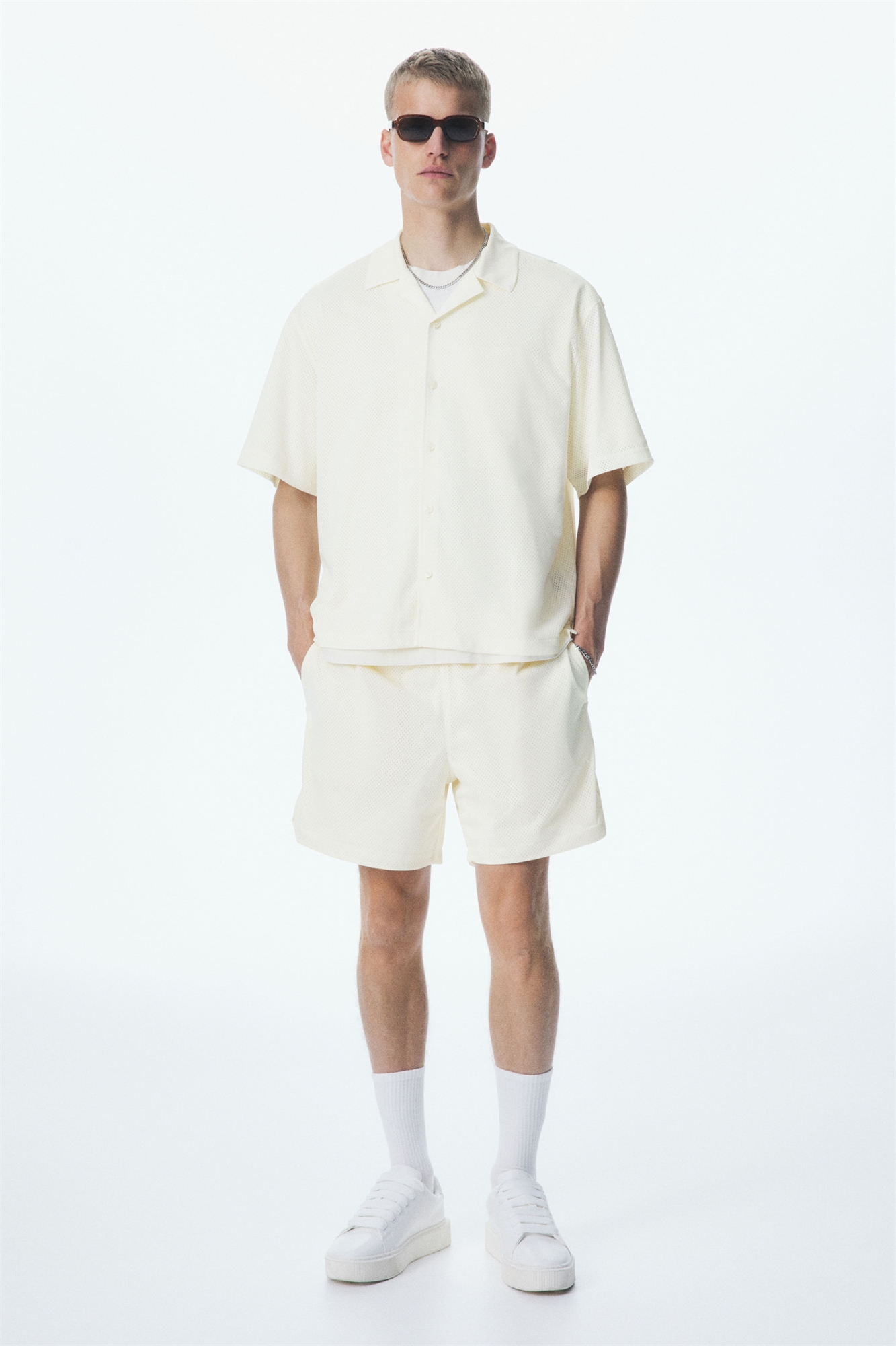 Рубашка с короткими рукавами из воздушной сетки с отложным воротником, французской застежкой и прямым подолом с боковыми разрезами. Свободный крой с объемным, но не чрезмерным силуэтом.