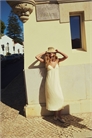 Длинное платье из тканого материала с V-образным вырезом и бретелями-спагетти, которые продеваются в петли и завязываются сзади. Облегающий крой в области бюста с двухслойными чашечками. Слегка расклешенная юбка.