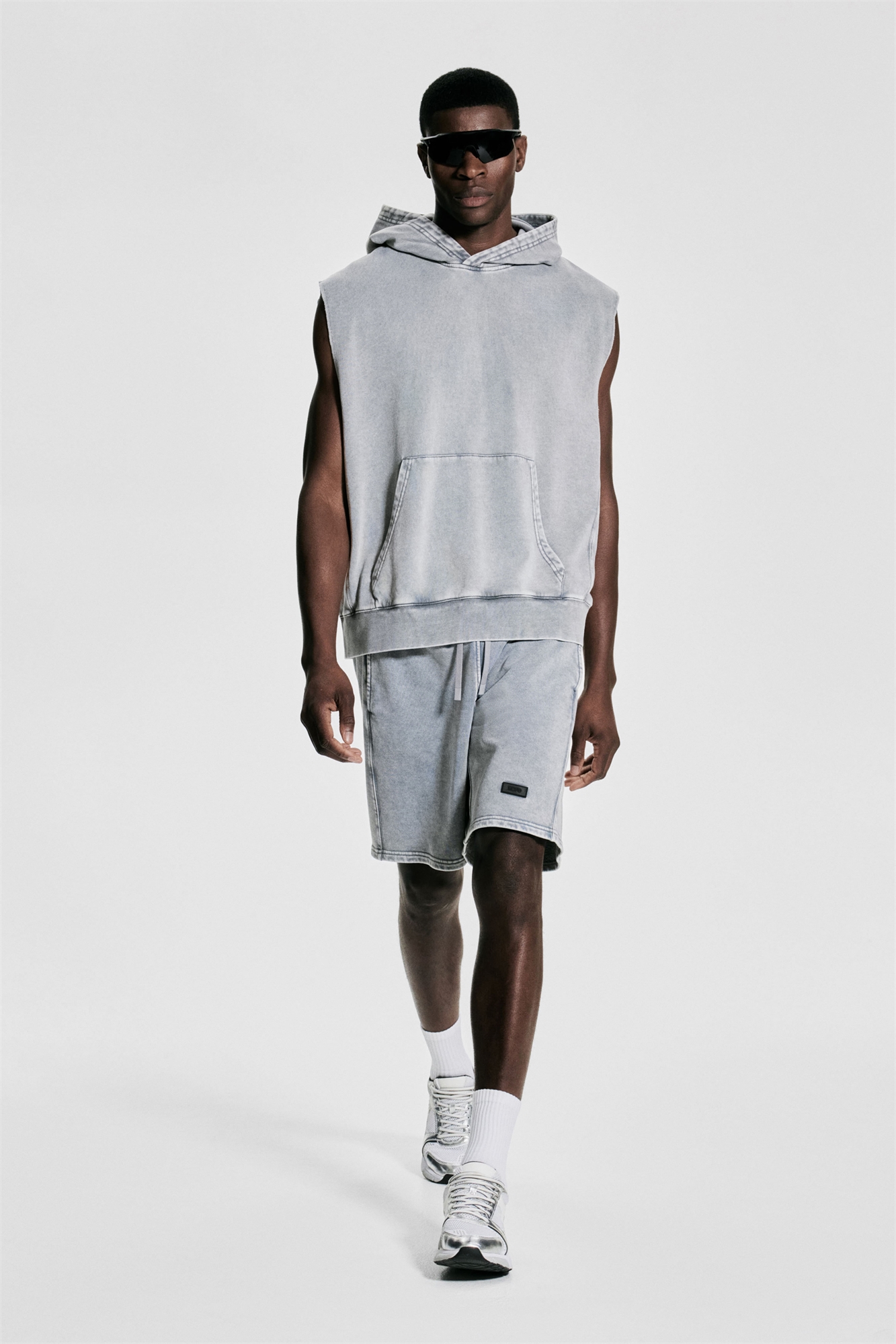 Спортивная толстовка без рукавов из толстовочной ткани средней плотности с мягкой начесом внутри. Свободный крой, капюшон на подкладке, необработанные края пройм, карман-кенгуру и широкая ребристая окантовка по подолу.