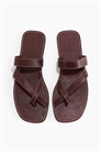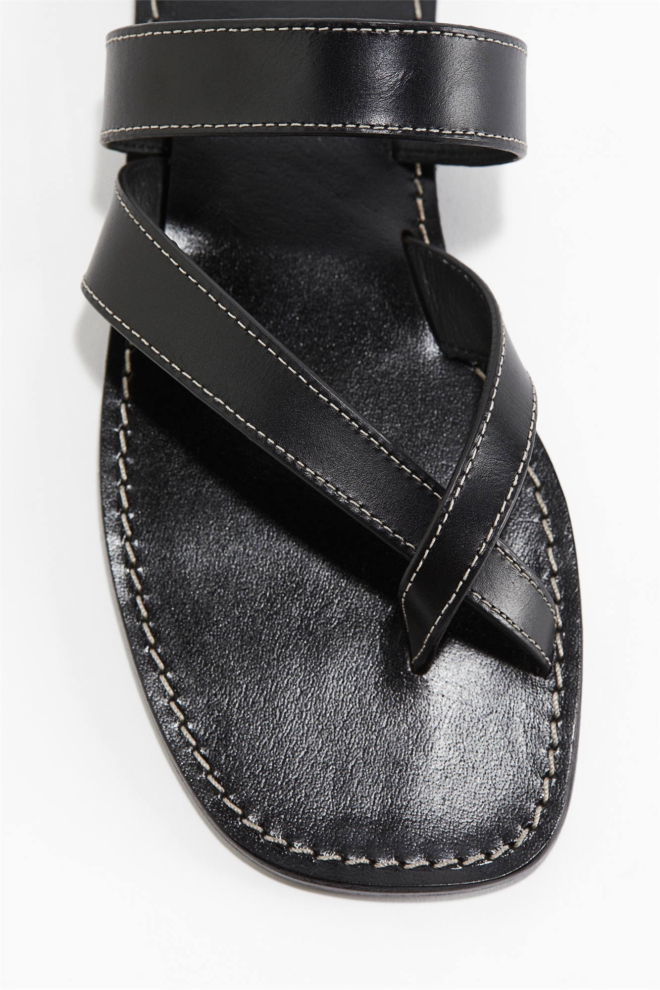 Плоские сандалии из кожи с прострочкой контрастного цвета, квадратным носком и перекрещивающимися ремешками, образующими петлю на носке.