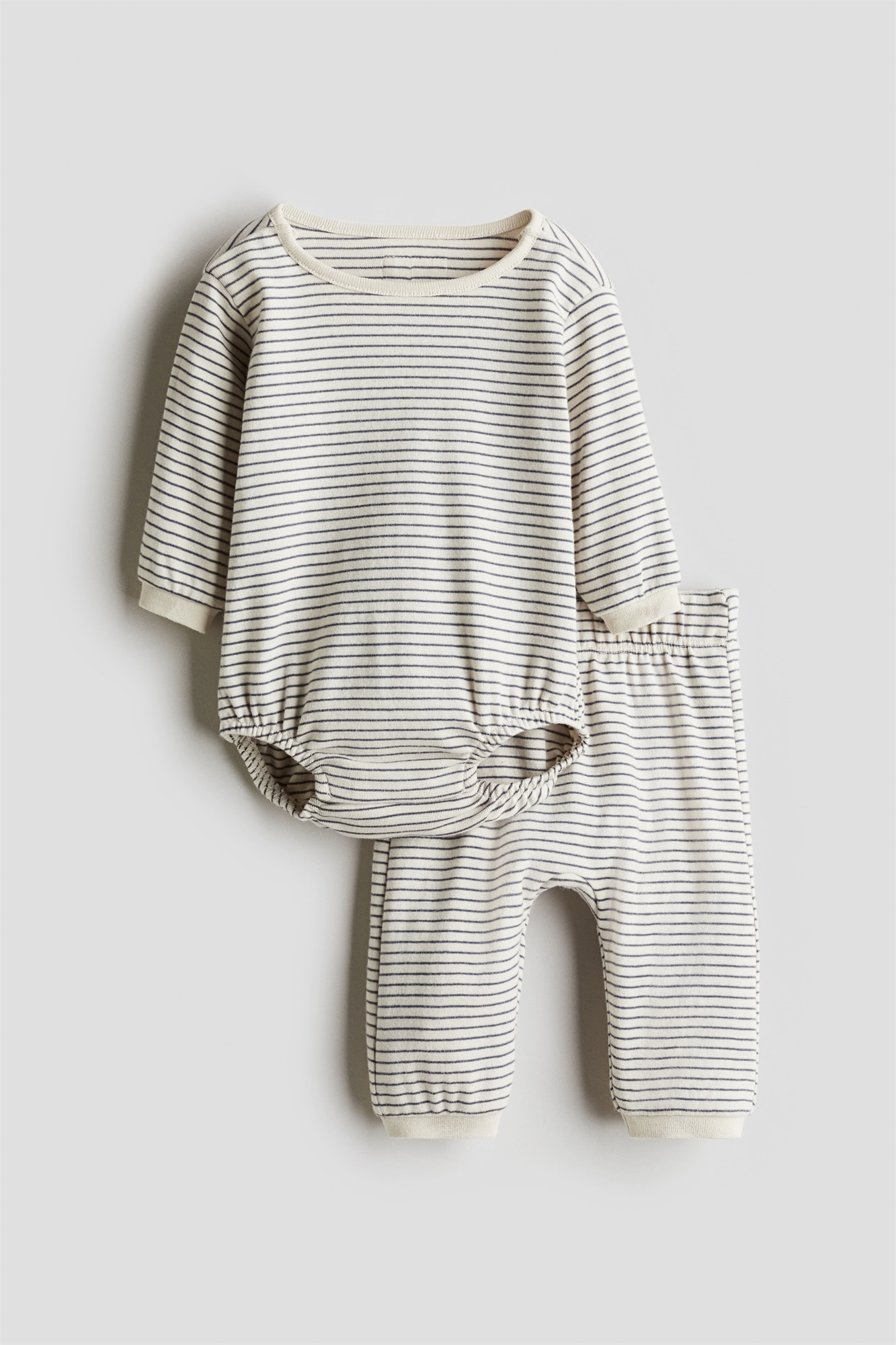 Комплект из комбинезона и брюк из мягкого хлопкового джерси. Боди-комбинезон с просторным кроем и круглым вырезом с ребристой отделкой и застежками на кнопках с одной стороны. Длинные рукава с ребристыми манжетами и мягкая, узкая резинка вокруг ног. Застежки внизу для удобства переодевания. Брюки с утяжкой на талии и ребристыми манжетами по краям.