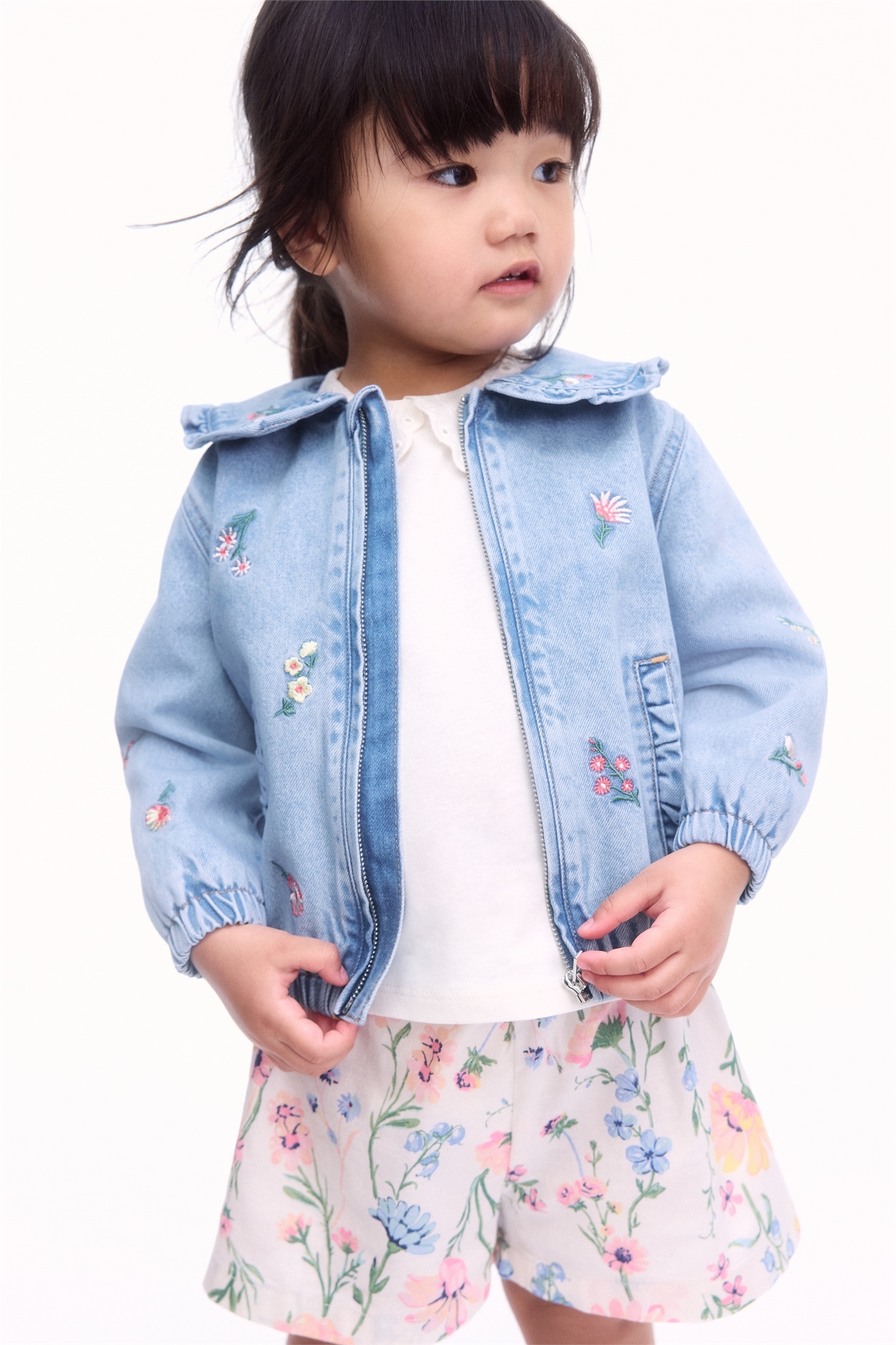 Куртка из мягкого хлопкового денима с вышитыми деталями. Закругленный воротник с оборками, потайная застежка-молния спереди с защитой подбородка от натирания и декоративные карманы с оборками. Эластичные манжеты и подол. На подкладке.