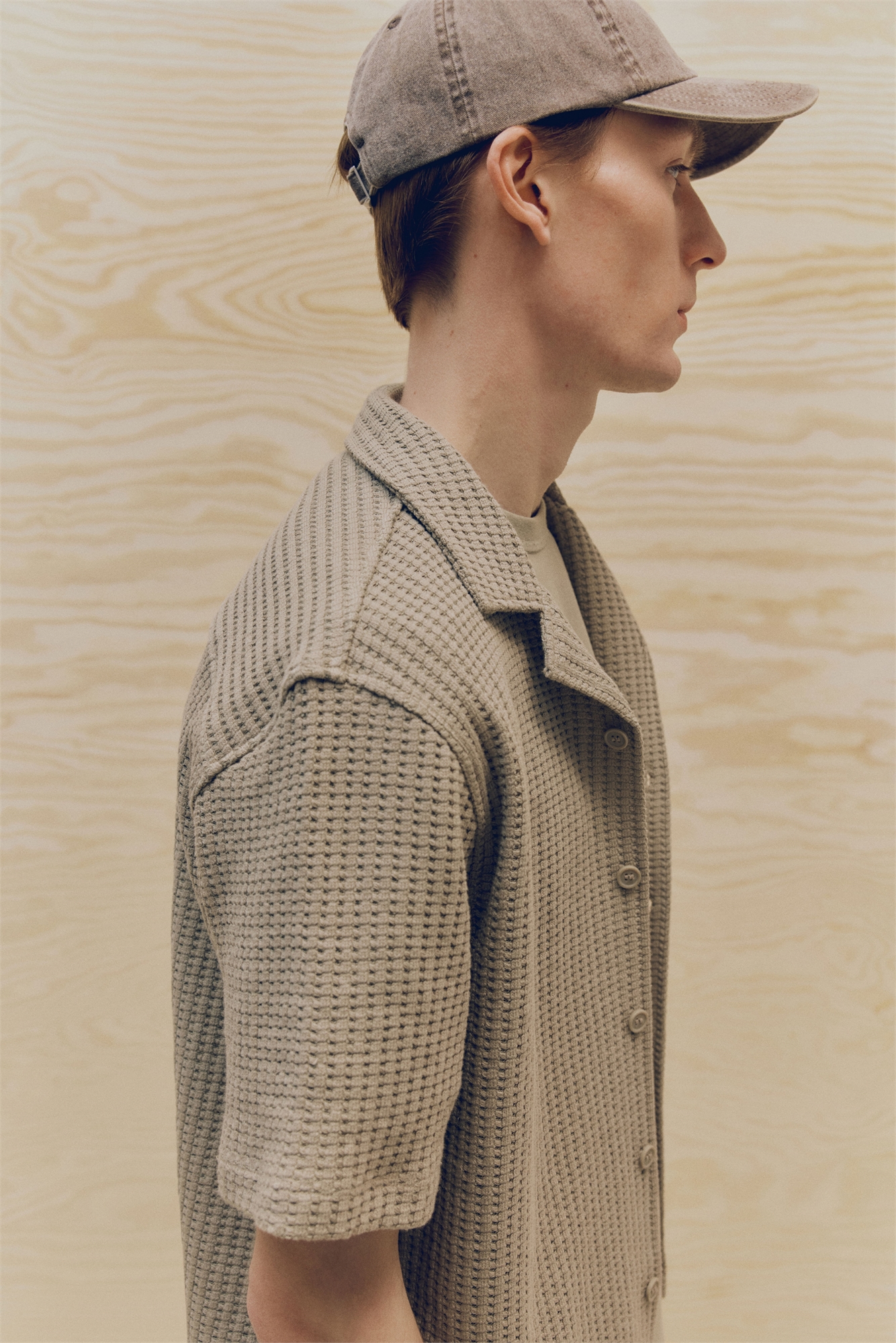 Рубашка с короткими рукавами из мягкого вафельного джерси с курортным воротником, французским передом, вырезом на спине, спущенными плечами и прямым подолом с разрезом по бокам. Свободный крой для пышного, но не чрезмерно большого силуэта.