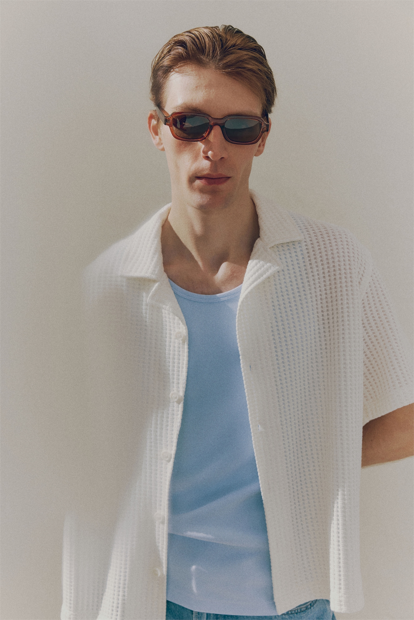 Рубашка с короткими рукавами из мягкого вафельного джерси с курортным воротником, французским передом, вырезом на спине, спущенными плечами и прямым подолом с разрезом по бокам. Свободный крой для пышного, но не чрезмерно большого силуэта.