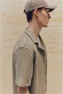 Рубашка с короткими рукавами из мягкого вафельного джерси с курортным воротником, французским передом, вырезом на спине, спущенными плечами и прямым подолом с разрезом по бокам. Свободный крой для пышного, но не чрезмерно большого силуэта.