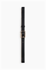 Ремень из мелованной ткани с акцентной цветной строчкой и квадратной металлической пряжкой.
