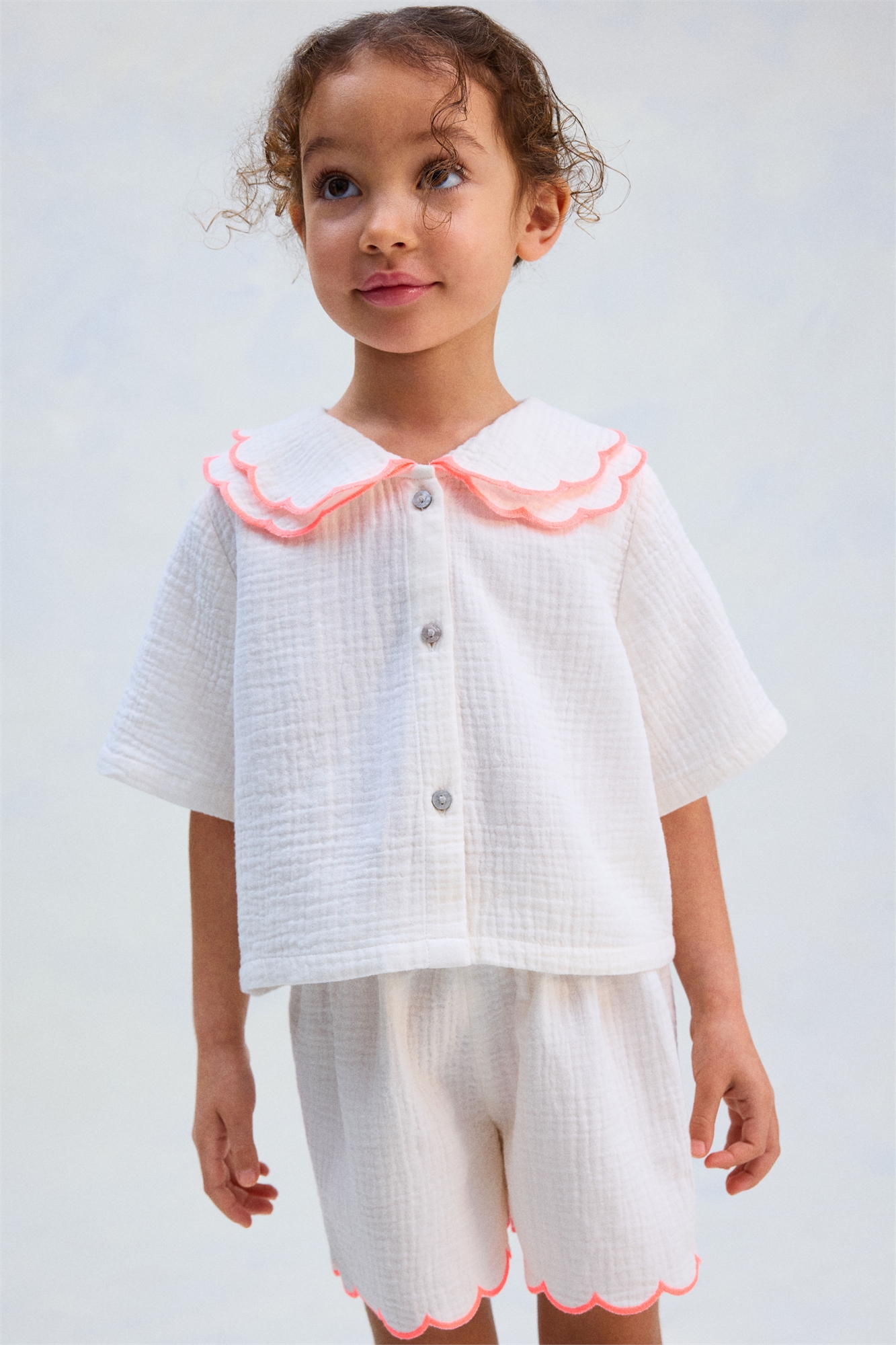 H&M Adorables. Комплект из блузки и шорт из мягкого муслина из высококачественного хлопка с отделкой оверлоком и гребешками. Блузка с двухслойным воротником, пуговицами спереди и короткими рукавами. Шорты с регулируемой эластичной талией. Коллекция H&M Adorables - это подборка удобных и качественных вещей, которые не подвластны времени.