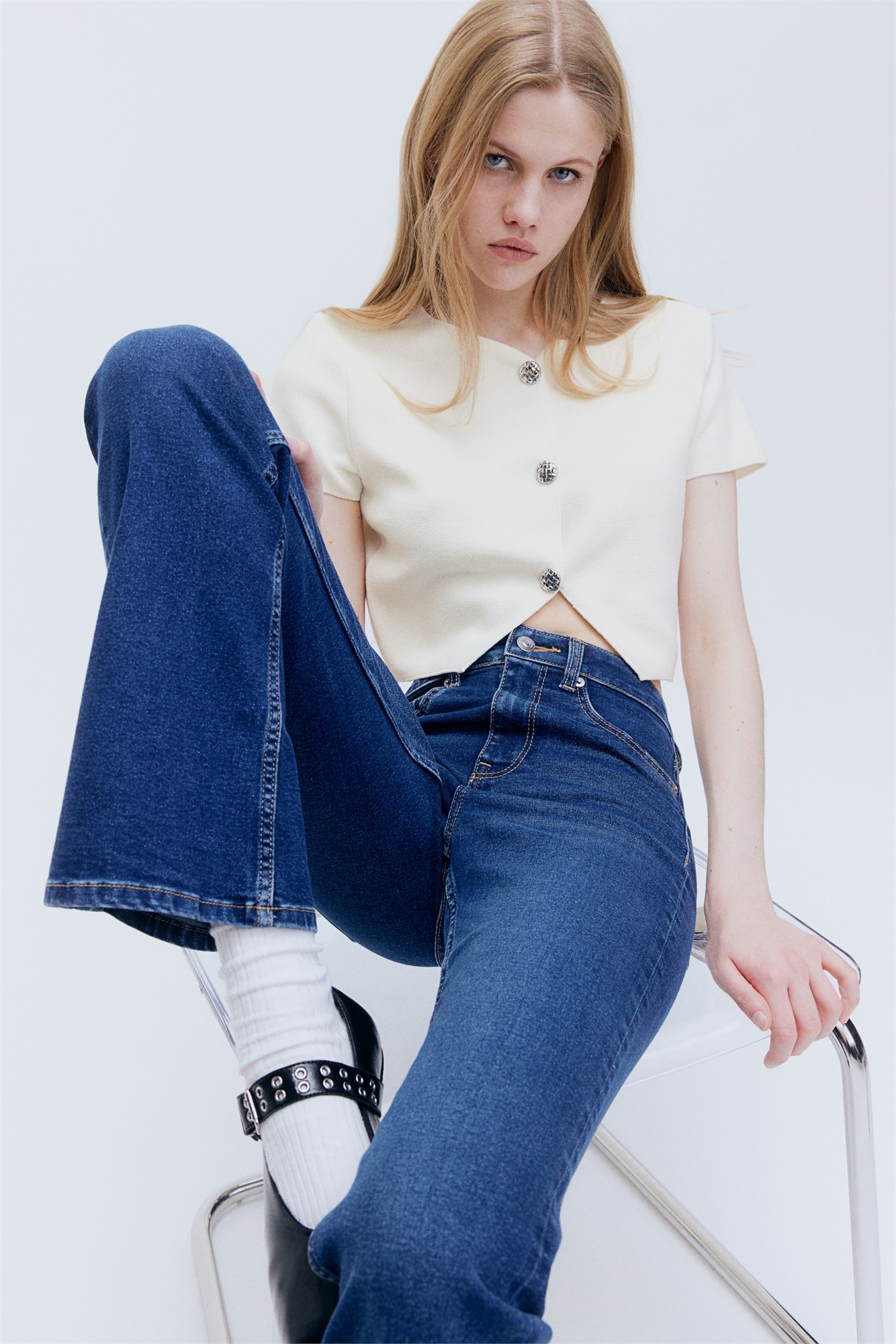 Короткий приталенный кардиган из эластичного джерси с фактурными металлическими пуговицами спереди и короткими рукавами. Подол прямого покроя с отогнутыми краями у проймы.