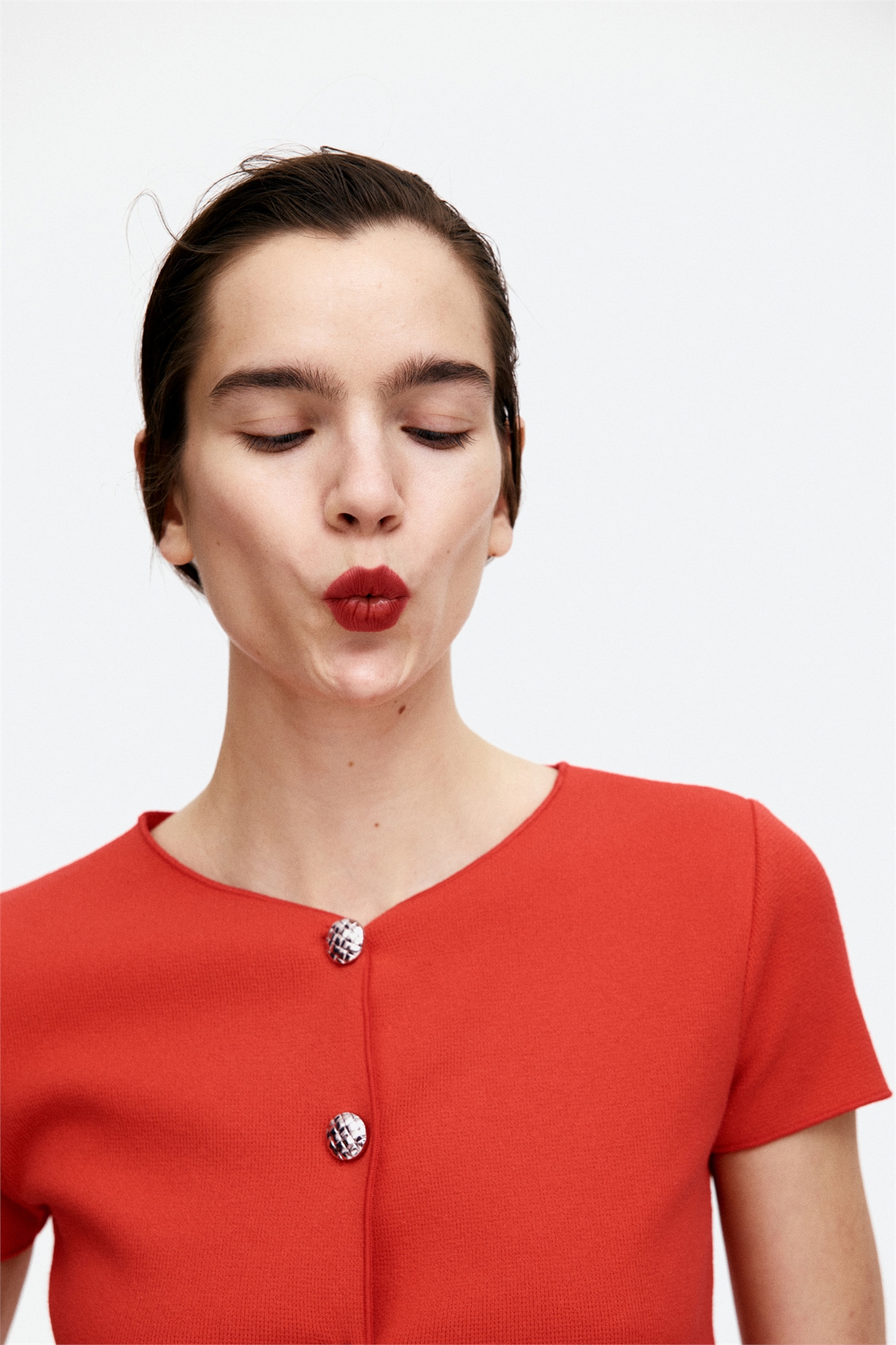 Короткий приталенный кардиган из эластичного джерси с фактурными металлическими пуговицами спереди и короткими рукавами. Подол прямого покроя с отогнутыми краями у проймы.