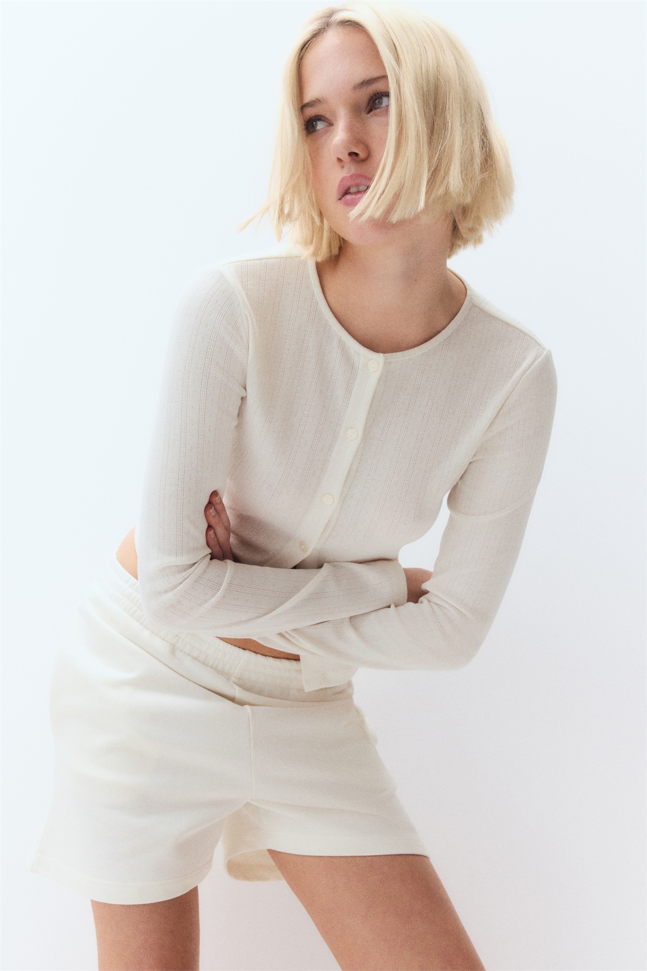 Приталенный кардиган из мягкого трикотажа пуантель с круглым вырезом, пуговицами спереди и длинными рукавами.