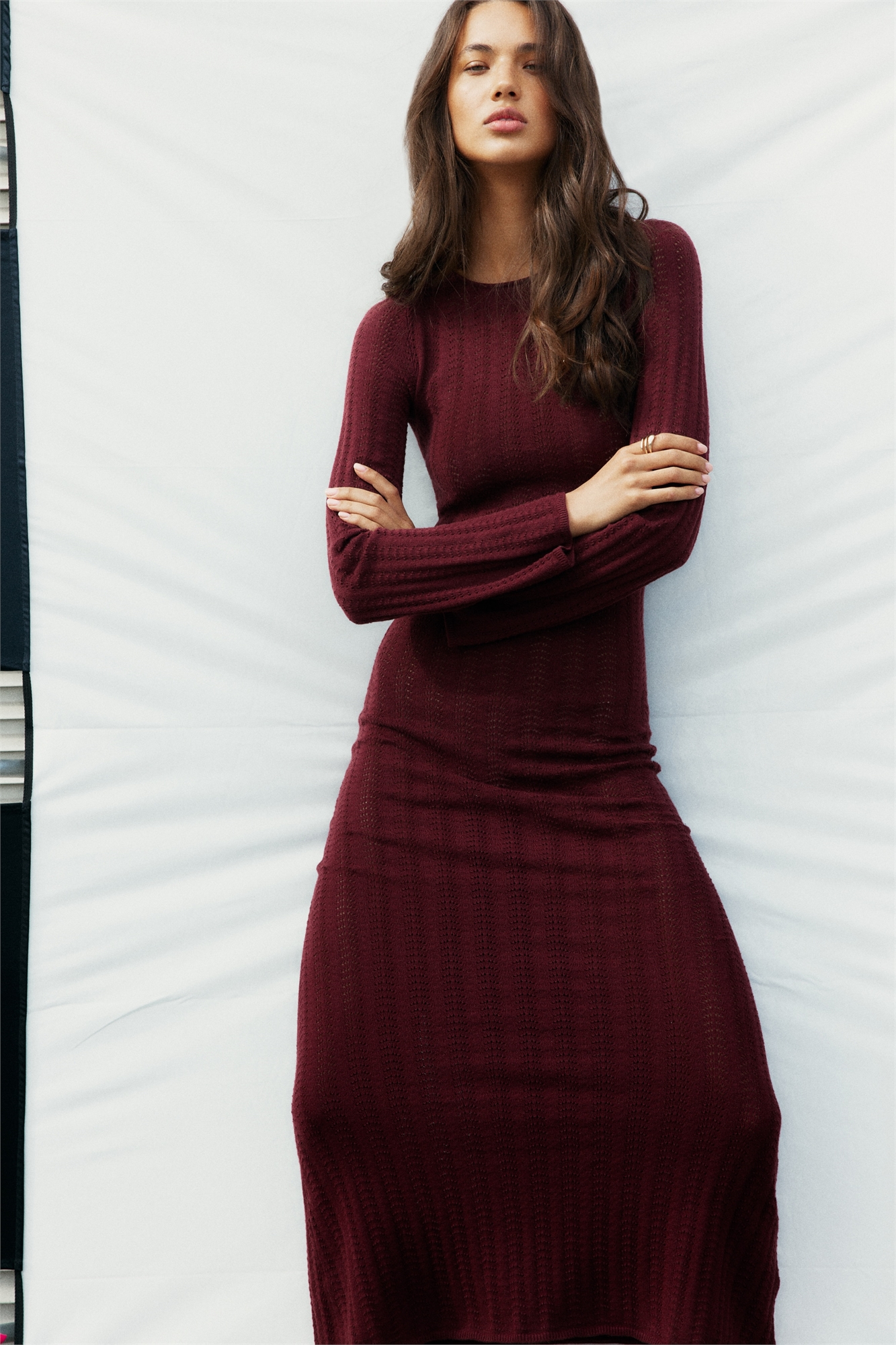 Приталенное платье длиной до колен из мягкого хлопка с пуантельевой вязкой, с нежным вырезом-лодочкой и частично открытой спиной с пуговицей в верхней части. Длинные рукава, манжеты и подол слегка расклешенные.