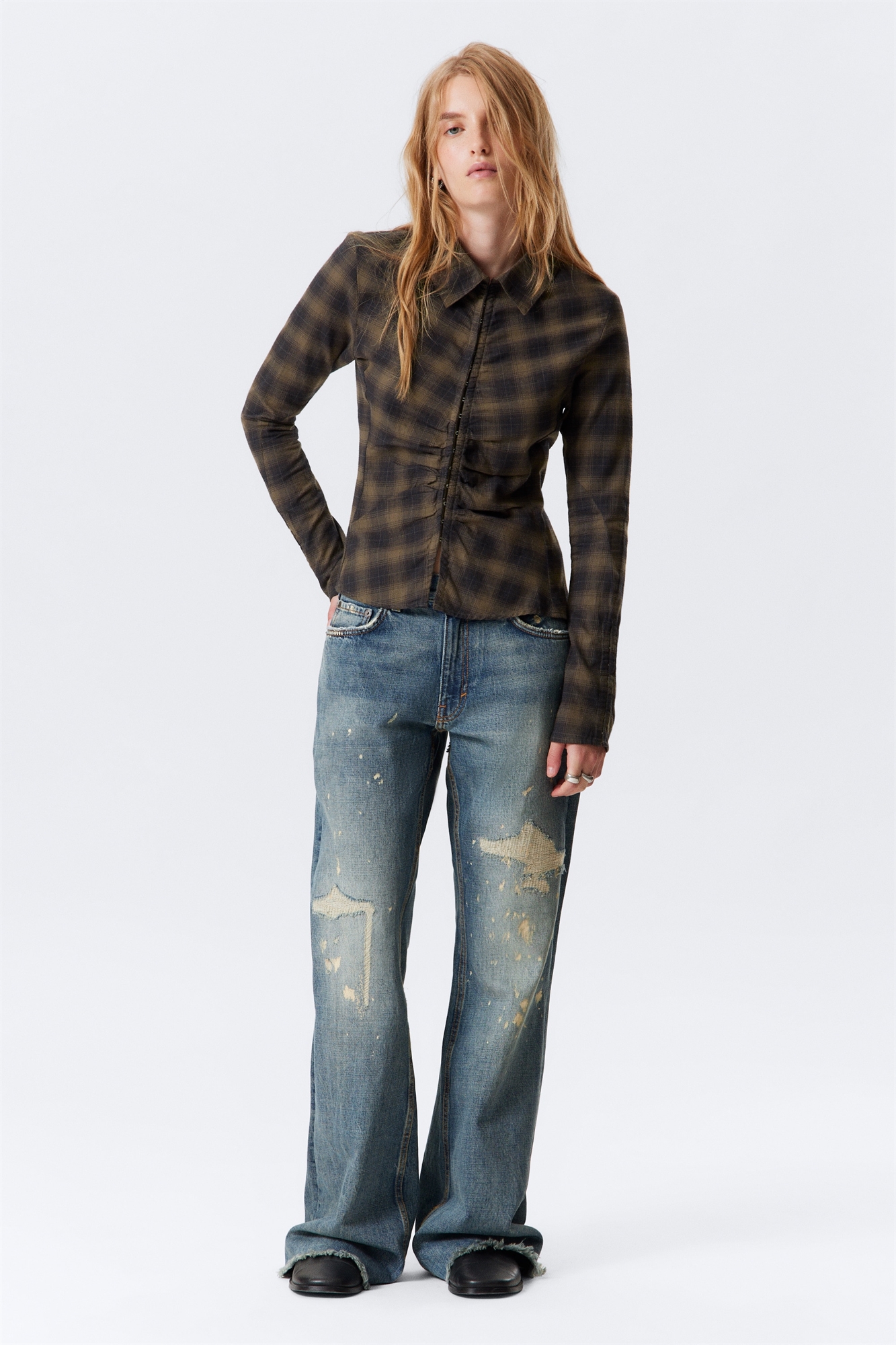 Приталенная рубашка из мягкой атласной ткани. Двухслойный воротник, застежки-крючки спереди и рюши для эффекта сборки. Приталенный крой дополняют длинные рукава с застежками-крючками.