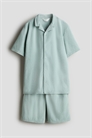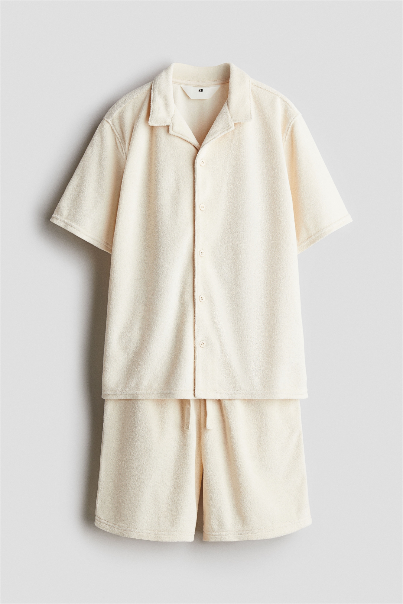 Комплект из рубашки и шорт из мягкой махровой ткани. Рубашка с короткими рукавами, отложным воротником, пуговицами спереди и спущенными плечами. Шорты с эластичным утягивающим поясом и диагональными передними карманами.