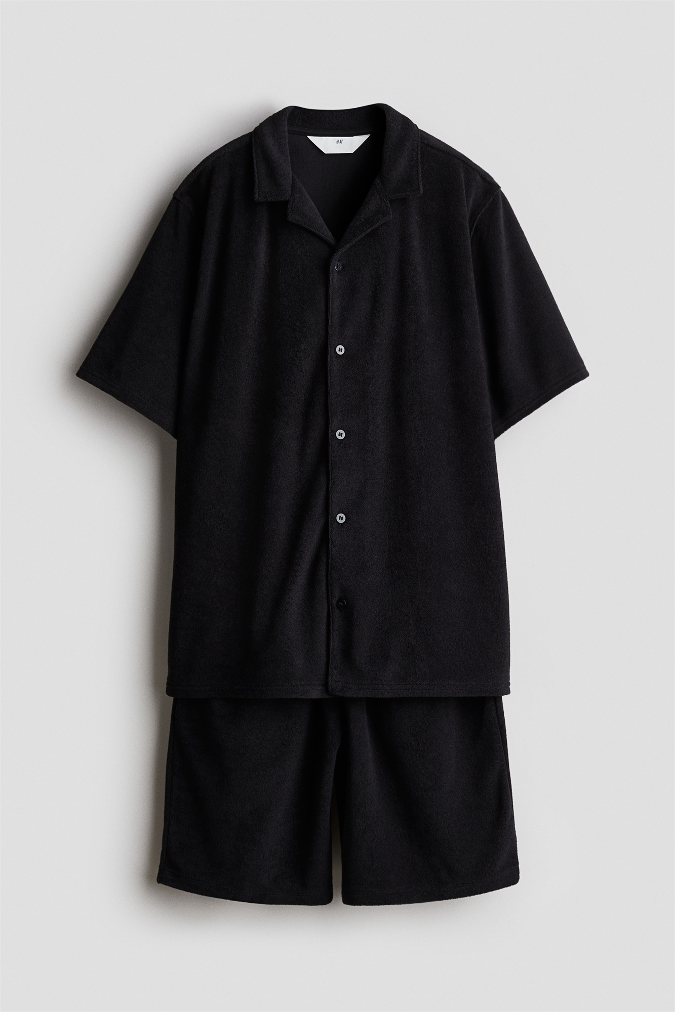 Комплект из рубашки и шорт из мягкой махровой ткани. Рубашка с короткими рукавами, отложным воротником, пуговицами спереди и спущенными плечами. Шорты с эластичным утягивающим поясом и диагональными передними карманами.