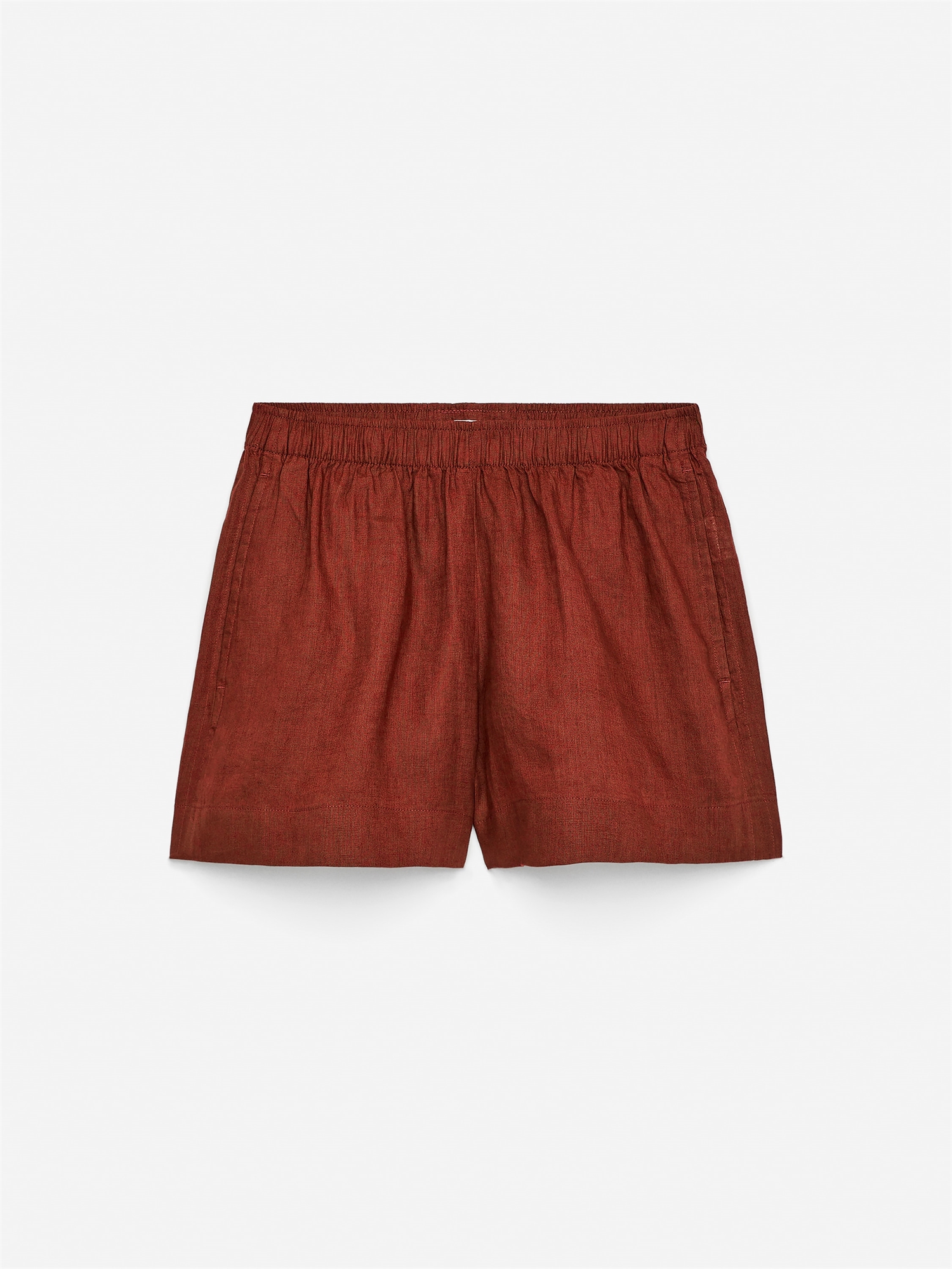 Льняные шорты с эластичной резинкой на талии и карманами в боковых швах.