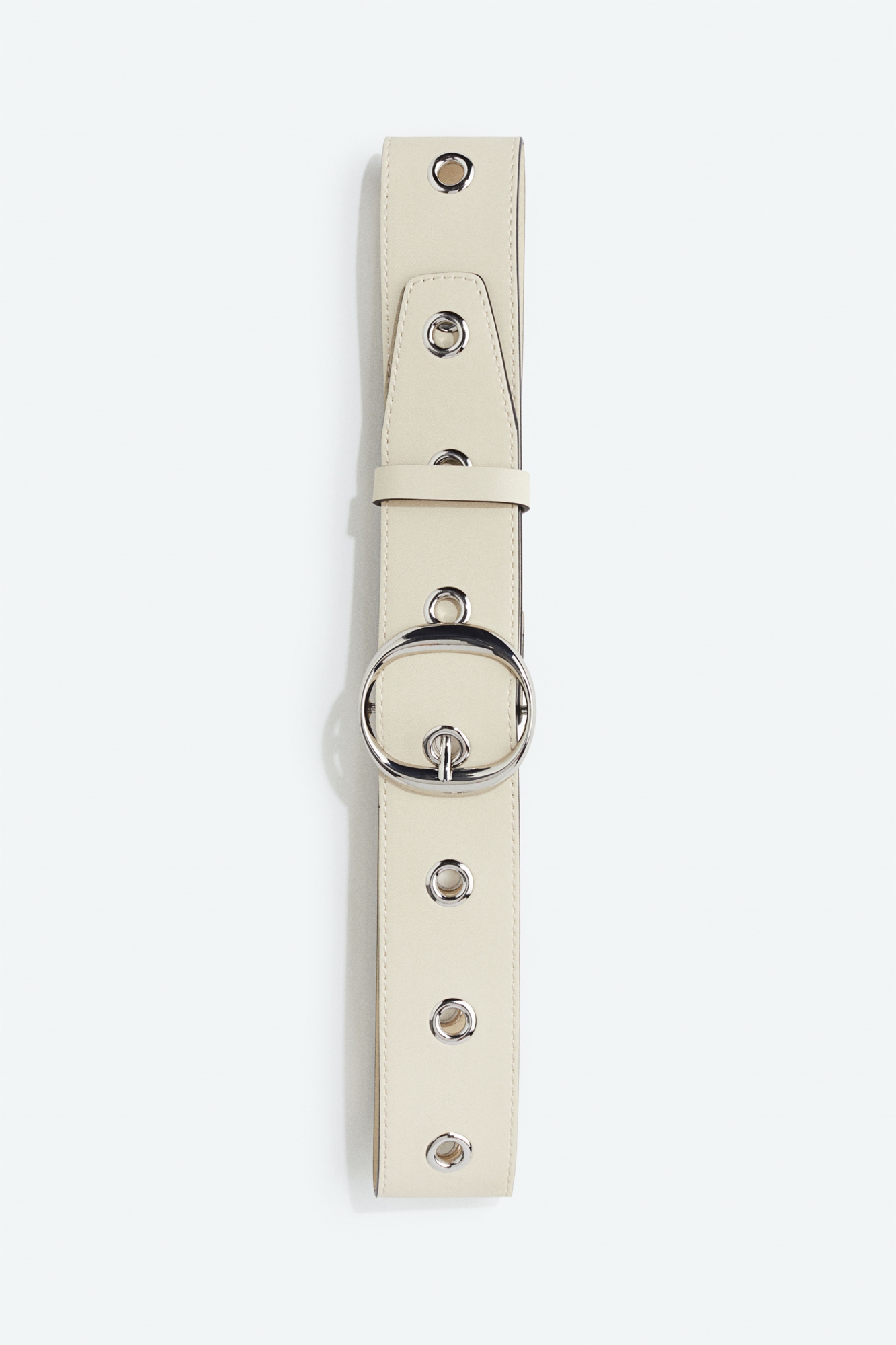 Мелованный ремень с круглой металлической пряжкой и металлическими люверсами по всему периметру.