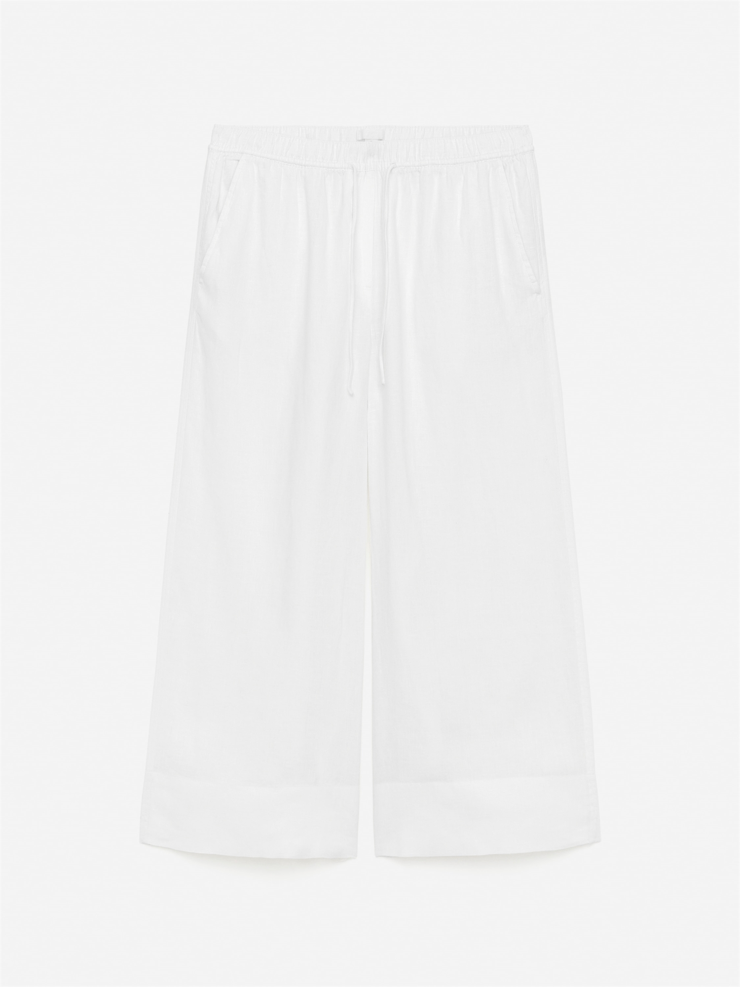 Льняные брюки с укороченными штанинами, эластичным поясом с утягивающим шнурком и косыми боковыми карманами.