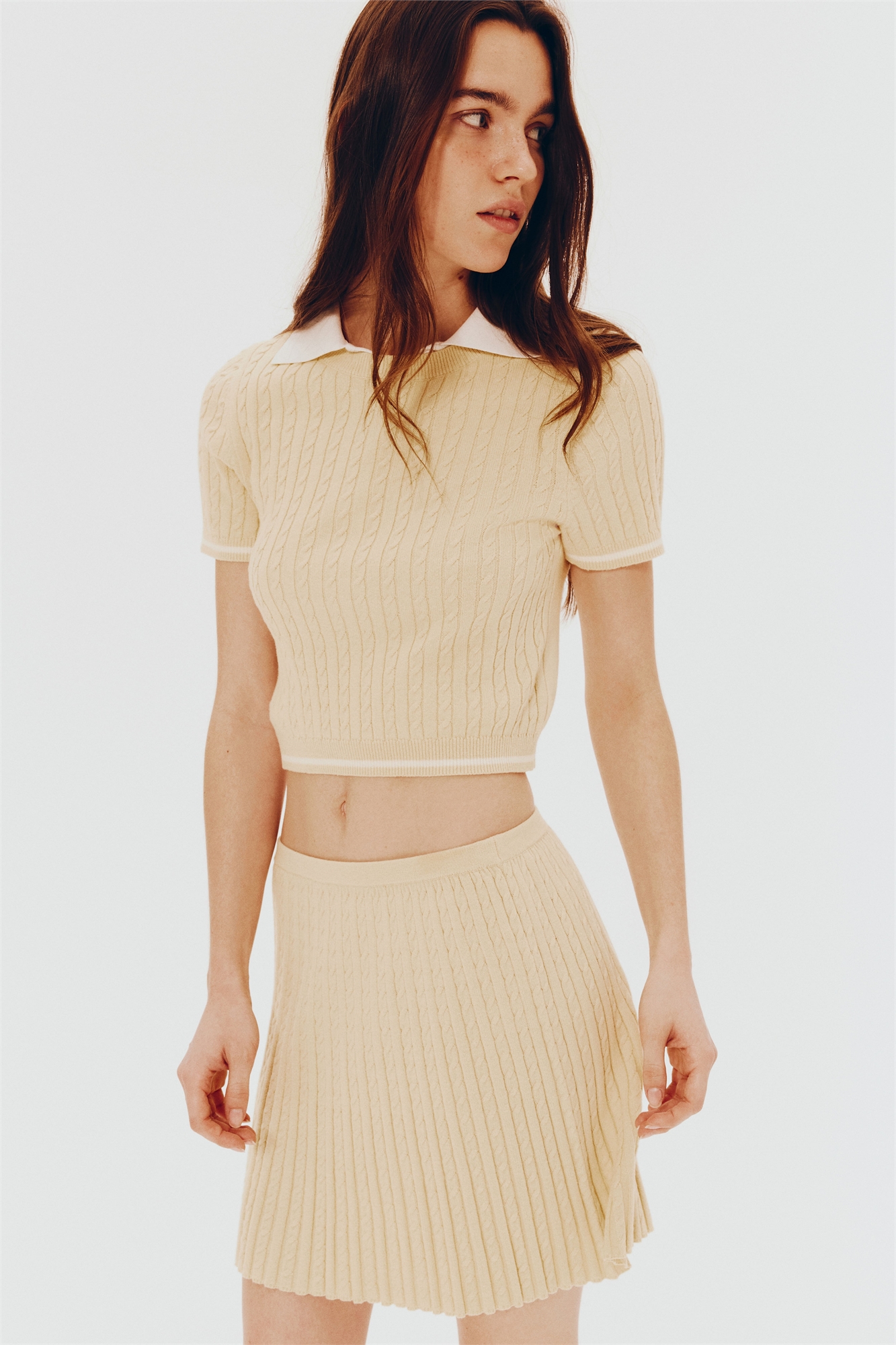 Короткая, слегка расклешенная юбка из мягкого трикотажа в рубчик со скрытой эластичной резинкой на талии.