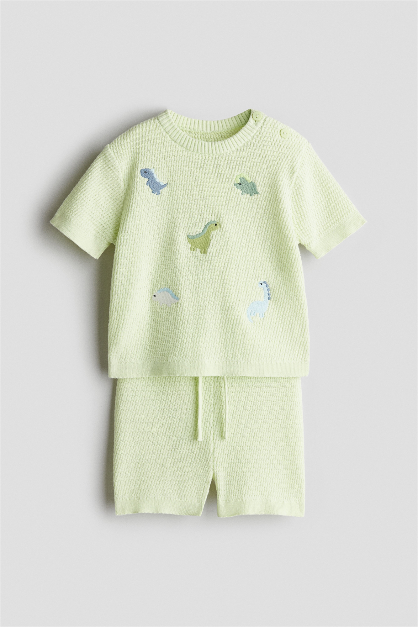 Комплект из футболки и шорт из мягкого фактурного хлопка. Футболка с вышитыми деталями спереди, круглым вырезом с ребристой отделкой, пуговицами на одном плече, манжетами и подолом с мелкой тесьмой. Шорты с эластичной, утягивающейся талией и ребристыми манжетами.