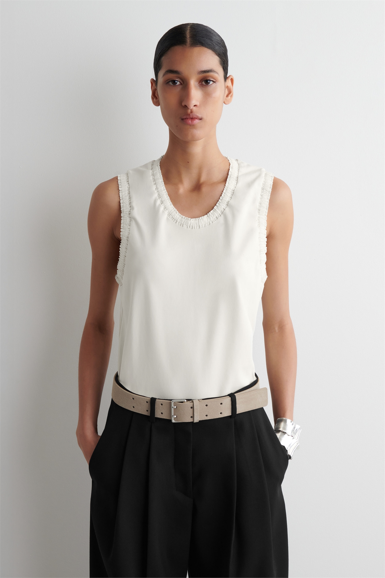 Этот изысканный танк-топ, сшитый из мягкого хлопка-джерси, с рюшами по краю выреза и рукавов, создающими свежий женственный образ. Он выполнен в классическом черном цвете, который не требует особых усилий. Regular fit Материал: 92% хлопка, 8% эластана. Без учета отделки / Машинная стирка Длина по спинке для размера S составляет 58 см / Модель носит размер S