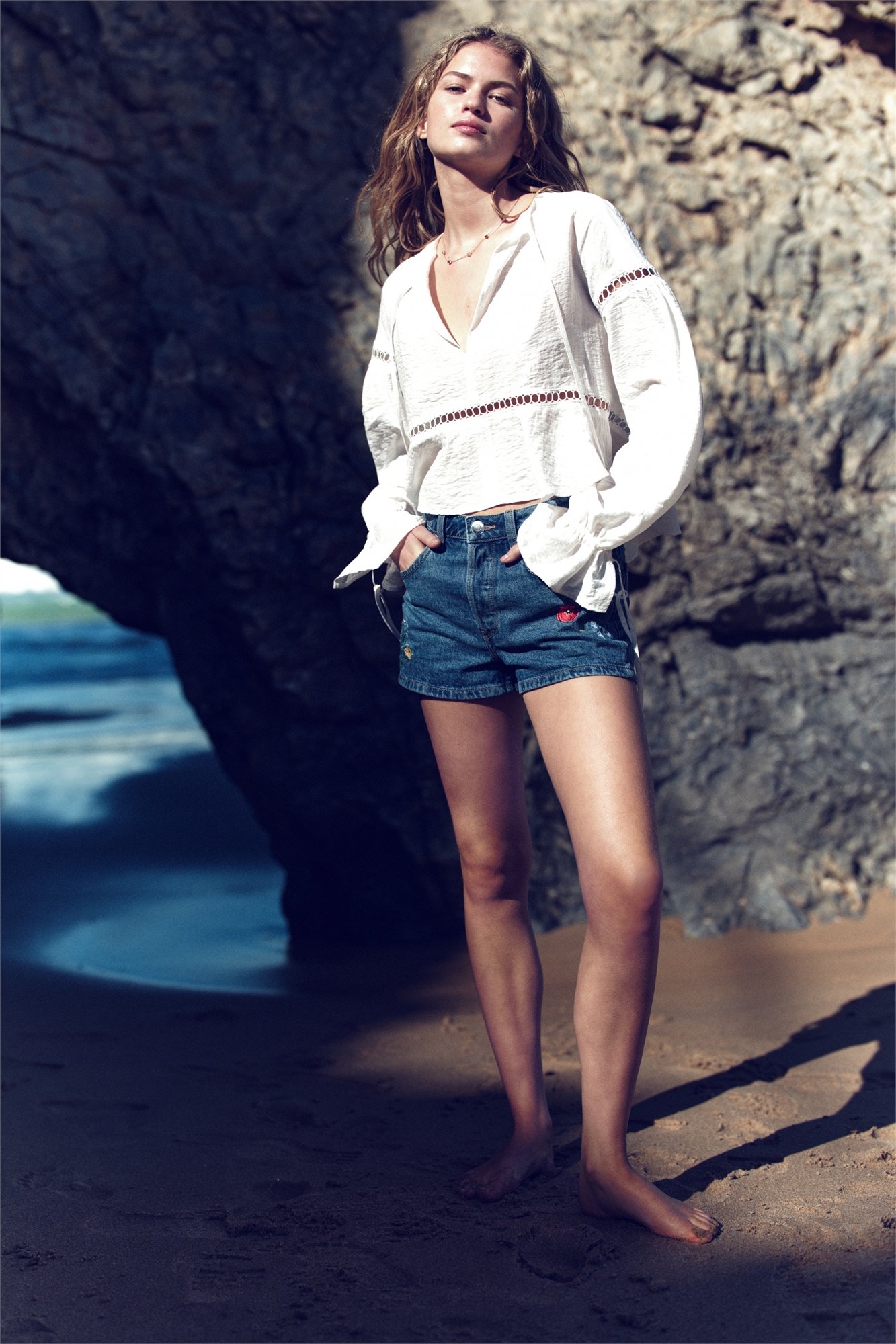 Шорты с 5 карманами из жесткого хлопкового денима с вышитыми мотивами. Высокая талия с ширинкой на пуговице.