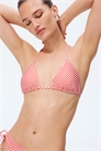 Бесшовный треугольный бикини на подкладке с чашечками со съемными вкладышами, придающими форму бюсту и обеспечивающими хорошую поддержку. Завязки сзади и на шее.