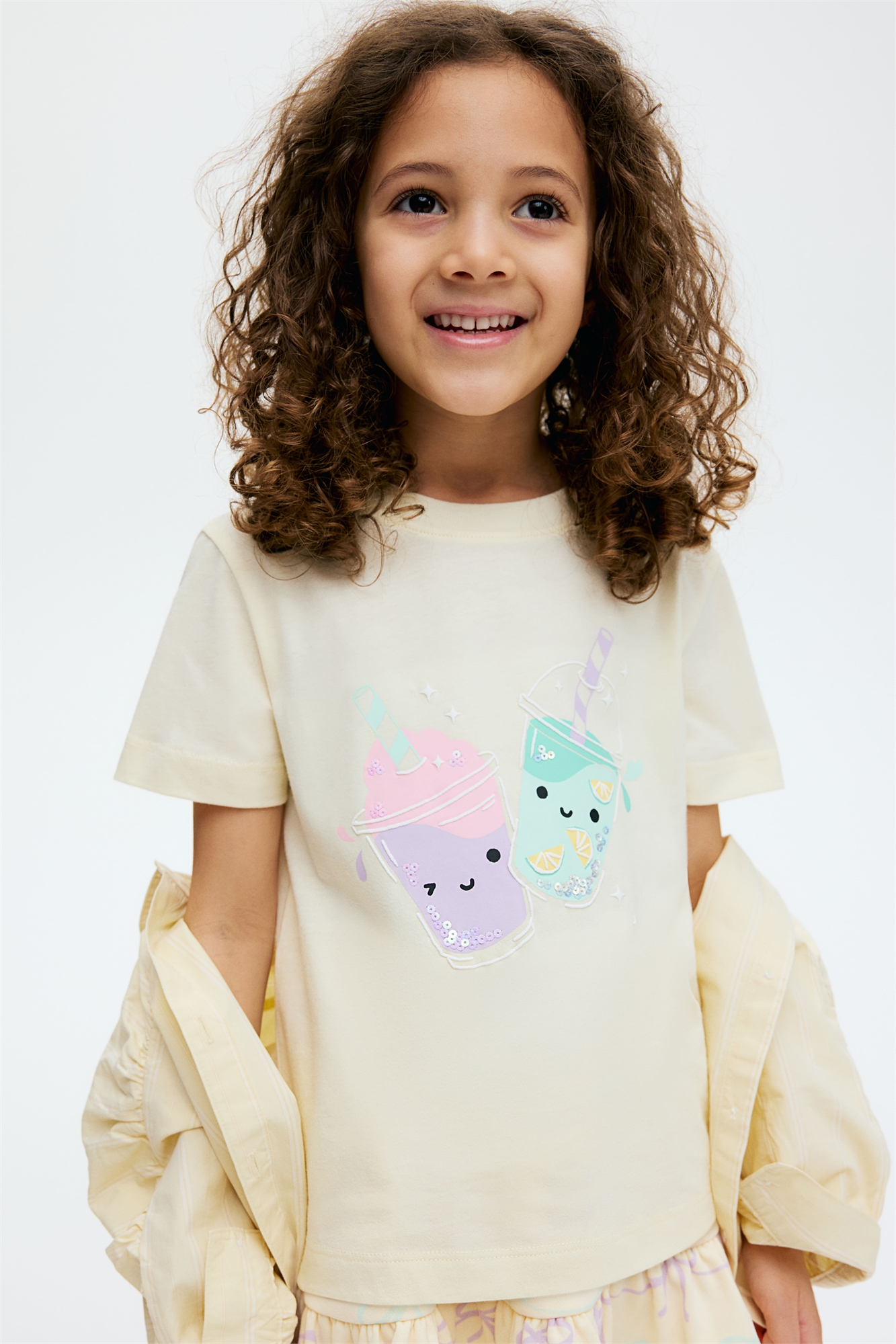 Футболка из хлопкового джерси с мотивом спереди. Круглый вырез с ребристой отделкой, спущенные плечи и короткие рукава.