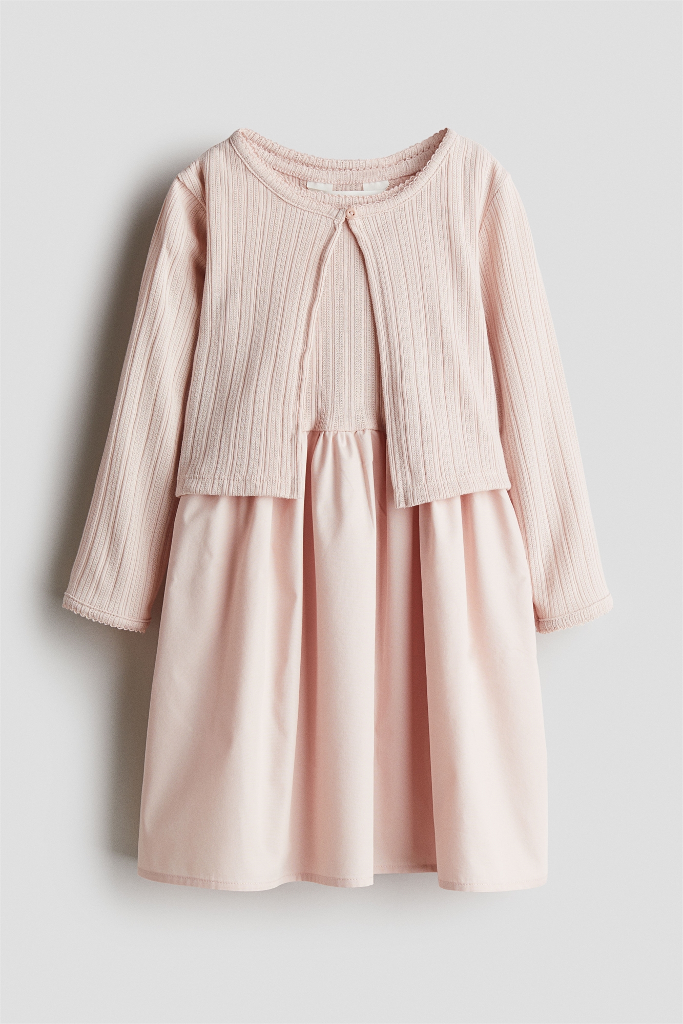 Комплект из платья и кардигана из мягкого пуантельевого трикотажа с отделкой пико. Платье без рукавов с расклешенной юбкой из хлопкового полотна. Круглый вырез и сборки на талии для придания объема. Кардиган с круглым вырезом, застежкой на пуговицу и длинными рукавами.