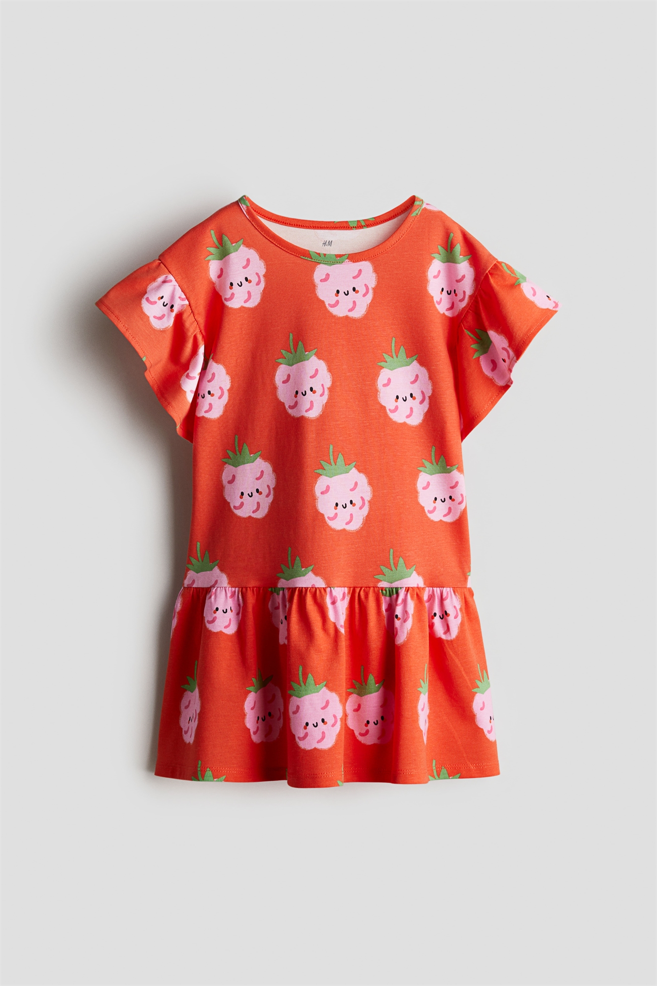 Свободное платье из мягкого хлопкового джерси с круглым вырезом, спущенными плечами и рукавами-воланами. Присборенный шов ниже талии и расклешенная юбка.