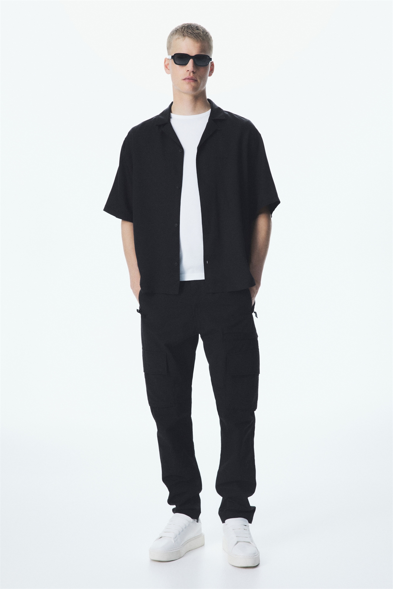 Брюки-карго из саржи, выполненные из хлопкового микса. Эластичная вставка на талии и ширинка на молнии с кнопкой. Диагональные боковые карманы на молнии, накладной карман на одной штанине, накладные карманы на ногах и накладные задние карманы. Регулярный крой для комфортной носки и классического силуэта.