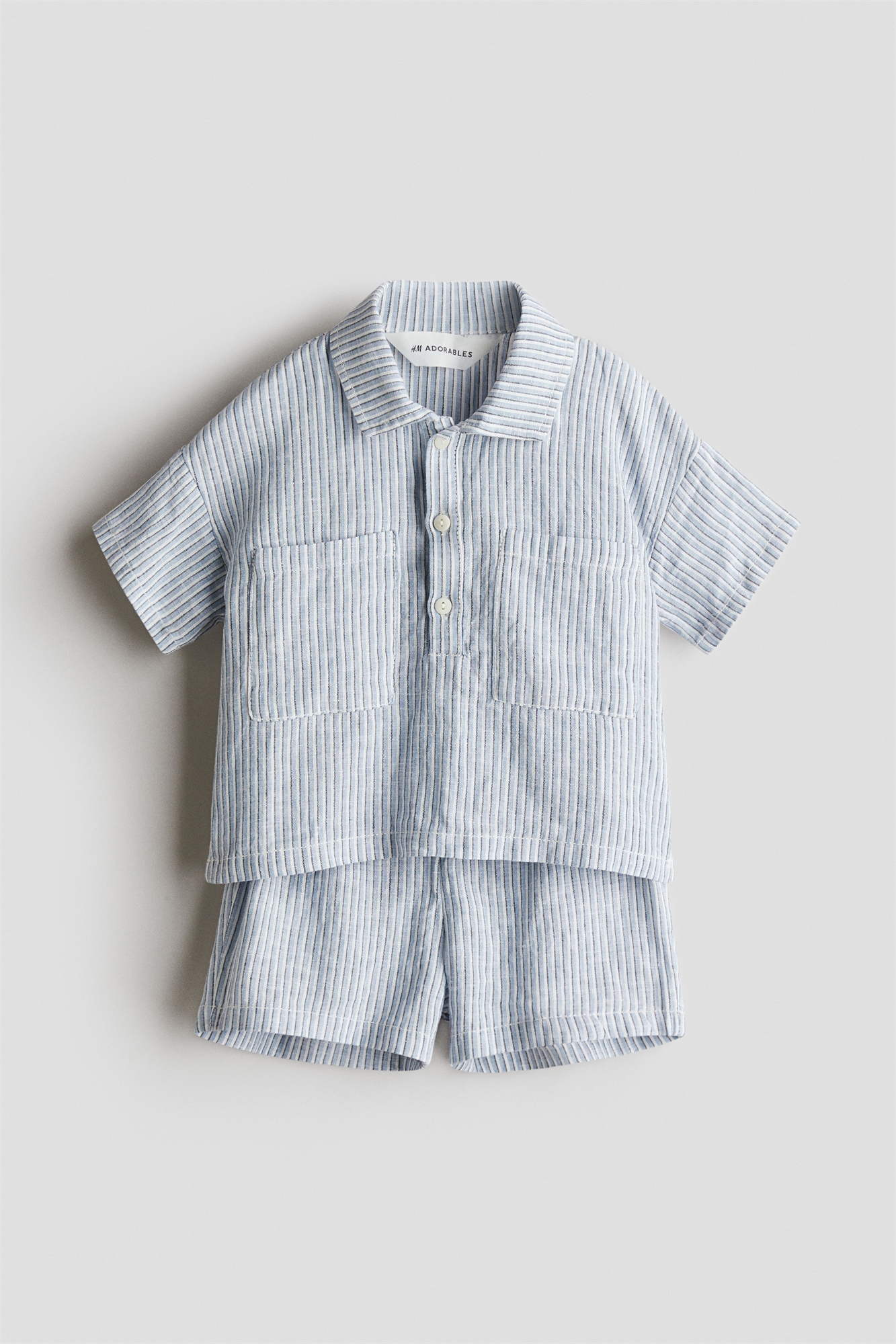 H&M Adorables. Комплект из рубашки и шорт из мягкой, воздушной ткани, изготовленной из смеси лиоцелла и льна. Рубашка с короткими рукавами, воротником, застежкой на пуговицы и открытыми нагрудными карманами. Спущенные плечи и подол в стиле поло. Шорты с регулируемой эластичной талией. Коллекция H&M Adorables - это подборка удобных и качественных вещей, не теряющих актуальности.