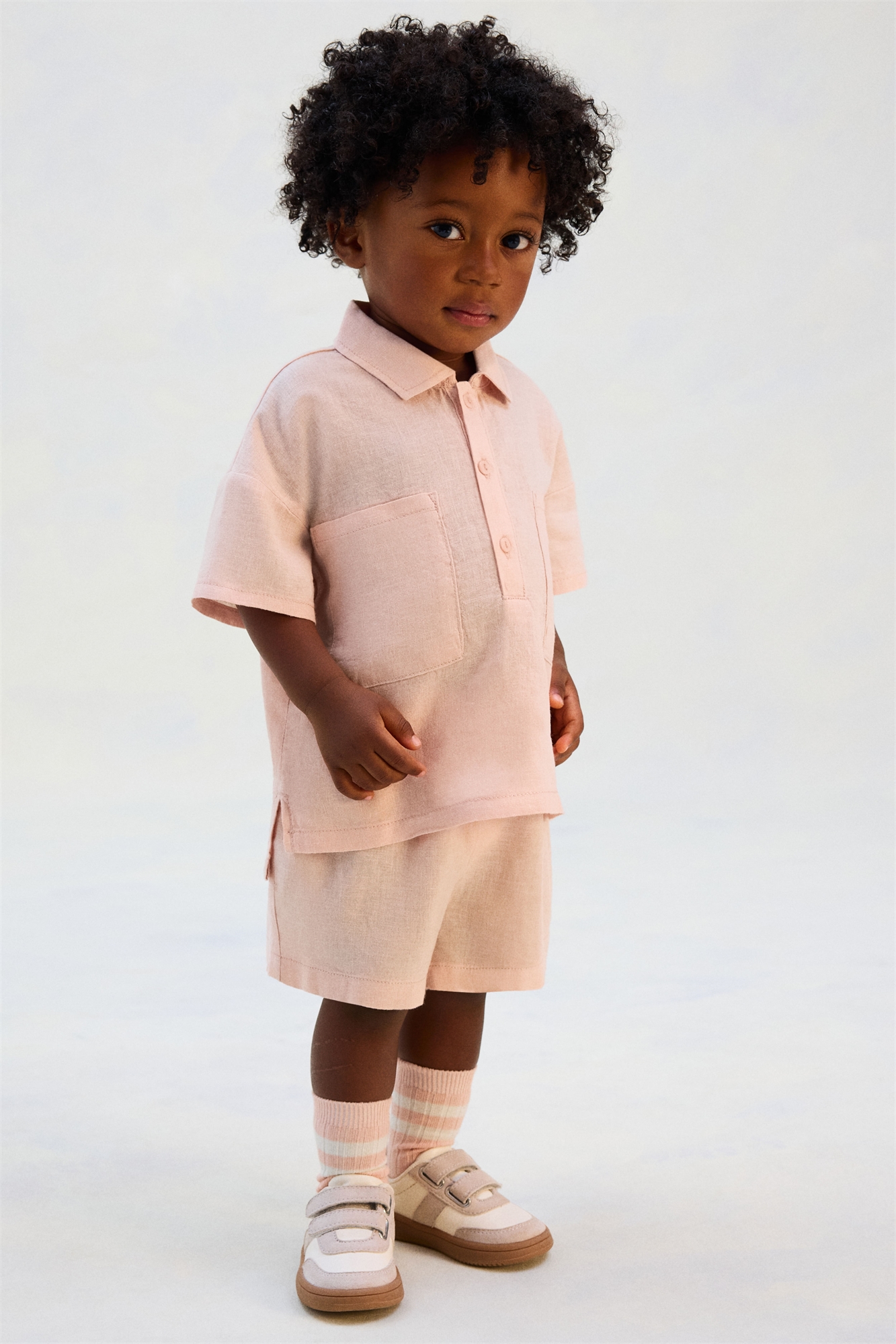 H&M Adorables. Комплект из рубашки и шорт из мягкой, воздушной ткани, изготовленной из смеси лиоцелла и льна. Рубашка с короткими рукавами, воротником, застежкой на пуговицы и открытыми нагрудными карманами. Спущенные плечи и подол в стиле поло. Шорты с регулируемой эластичной талией. Коллекция H&M Adorables - это подборка удобных и качественных вещей, не теряющих актуальности.