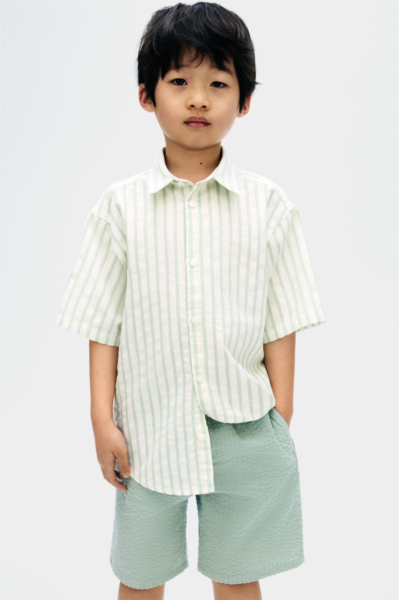 Шорты из воздушного хлопкового ситцевого полотна с эластичным поясом на завязках, фальшивой ширинкой, неброскими боковыми карманами и открытым задним карманом.