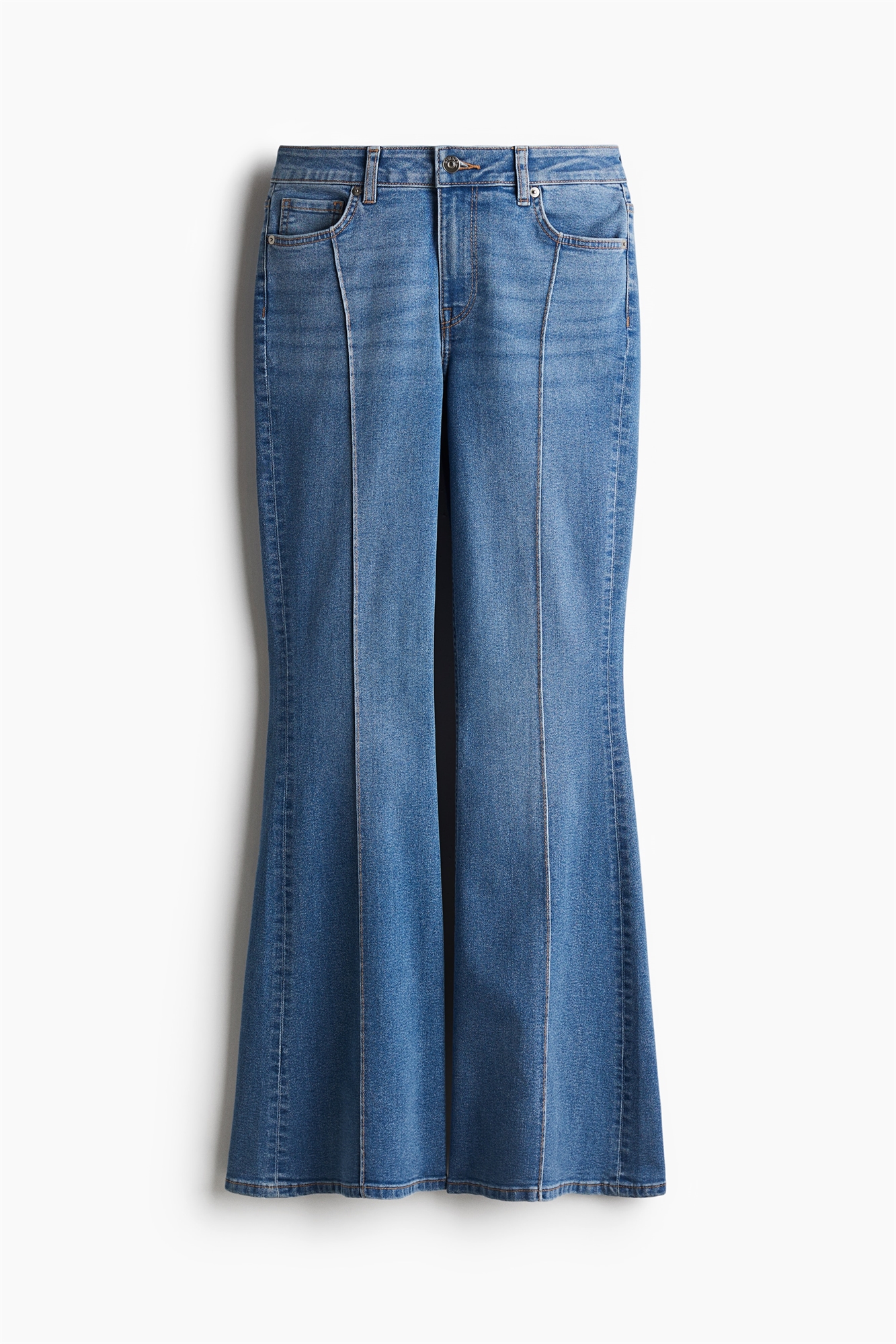 Джинсы с 5 карманами из денима с хорошей растяжимостью для комфорта. Расклешенные штанины с зауженной посадкой от талии до бедра и расклешенным кроем от колена до подола. Высокая талия, ширинка на молнии и пуговице. Задние карманы с клапаном и пуговицей. Пришитые складки спереди и сзади. Регулярная длина, рассчитанная на то, чтобы доходить до верхней части стопы с небольшим запасом или без него. Носите с кроссовками и ботильонами.