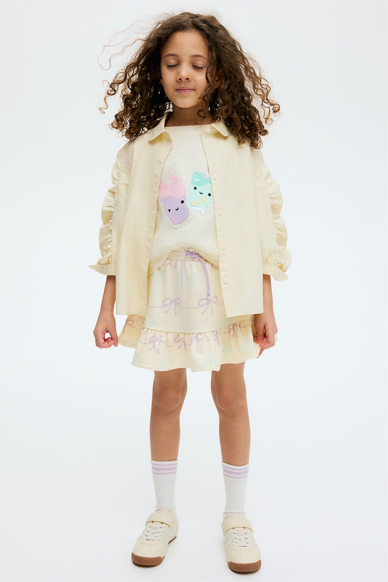 Юбка из легкой толстоватой ткани с принтом по всей поверхности. Эластичный пояс с завязками и широкий волан на подоле.